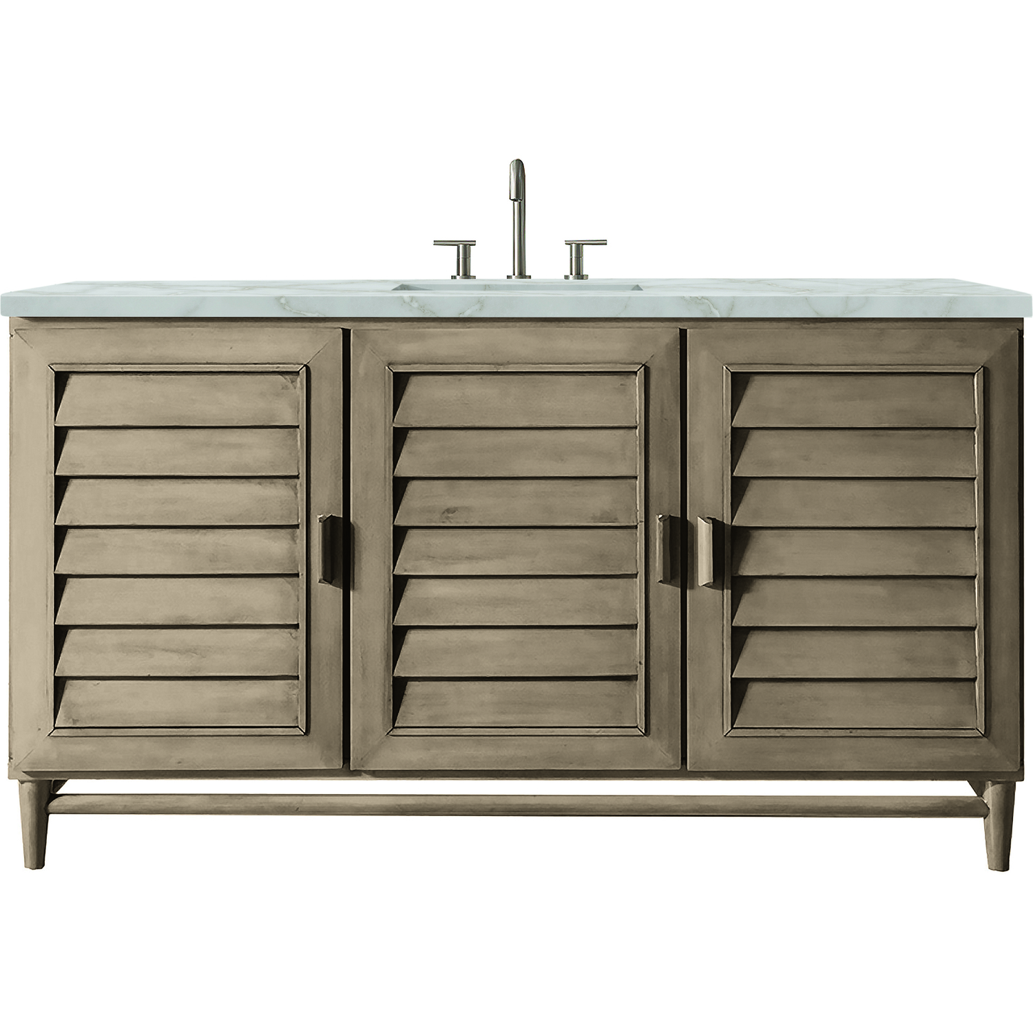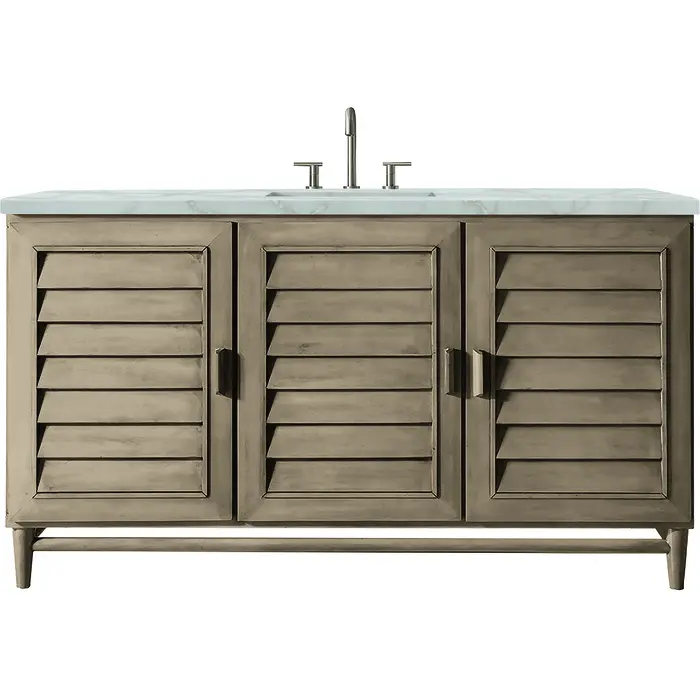The Portland 60" Single Vanity by James Martin Vanities embodies timeless simplicity with an air of coastal California cool. Featuring a relaxed Whitewashed Walnut finish, the Portland is a storage powerhouse. The three shutter-style doors open to reveal seven interior drawers, a removable bamboo drawer organizer, and a conveniently integrated USB/120V power outlet. Completed with a stunning Victorian Silver Silestone® top with undermount sink, Portland is a sophisticated and versatile vanity solution for your bathroom. This unit is enabled with FreePower wireless charging; featuring a single-device charger seamlessly embedded into the countertop, indicated by a light-up halo to the left of the sink. Designed for modern living, FreePower offers convenient, integrated, wireless charging when and where you need it.FreePower Wireless Charging; single-device unit left of sinkThree-door cabinet with seven interior drawersDrawer boxes feature English Dovetail joinery with premium, soft-close undermount drawer slides; doors feature soft-close, adjustable door hingesCabinet features a multi-stage premium finish coat to offer UV and moisture resistanceWhitewashed Walnut finish with matching wood handlesCountertop is pre-drilled for 8" widespread faucet(s); our 3cm eased edge countertops come with white porcelain rectangular sink(s) that ship separately and include mounting brackets for easy installationIntegrated 120V outlet with USB portsDrawers lined with our signature brushed aluminum laminate for easy cleaningRemovable bamboo drawer organizer includedMatching stone backsplash available as add-on purchaseFreestanding VanityFaucet(s) sold separatelyInfluenced by the American Mid-Century design aesthetic, the Portland Collection takes center stage in rich Whitewashed Walnut. With understated wood handles and shutter-style louvered doors, this collection has an air of casual simplicity with a relaxed coastal vibe.1 year warranty against manufacturer's defects. We will repair or replace any defective product, if the product is defective in material or workmanship at our discretion. No warranty is expressed or implied regarding damages resulting from consumer misuse.