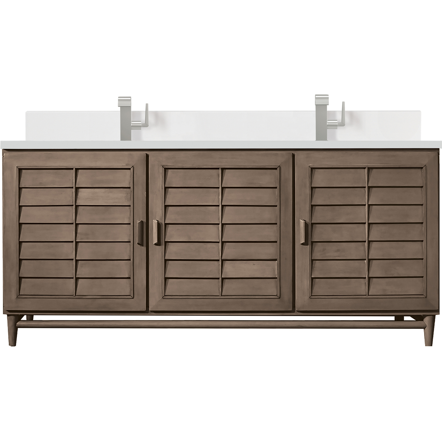 The Portland 72" Whitewashed Walnut Double Vanity features soft-close hinges on doors, with undermount soft-close slides on drawers and concealed ample storage. A proportionate and complementary design with wood knobs and brushed aluminum interior drawers. A classic, crisp 3 CM White Zeus Silestone Top and backsplash with undermount sinks perfectly complements the finish.Vanity set includes a 3cm eased edge White Zeus Silestone top with matching backsplash, two white porcelain rectangular sinks and mounting brackets for easy installation. Top is pre-drilled for two single hole faucets. Faucets not included.Three-door Whitewashed Walnut cabinet with 10 interior drawers.Constructed with a Soft Maple solid wood frame, Plywood panels that are covered with solid Poplar wood veneers.Drawer boxes are constructed using English Dovetail joinery, feature soft-close undermount glides and a Brushed Aluminum laminate drawer bottom.Includes one removable Bamboo drawer organizer trayMatching White Zeus 3cm Silestone backsplash included.Faucets sold separatelyThoroughly Modern. Inspired by the American design aesthetic prevalent from the mid 1930’s through the mid 1960’s; James Martin’s Portland Collection relies on pleasing proportions and simple, modern lines. The cabinets’ stylized, louver doors, conceal ample storage and, with a multitude of drawers - elements of organization. The two finish colors are James Martin’s most popular as well; Burnished Mahogany and Whitewashed Walnut. Our coordinating 28” Mirrors were designed to compliment all cabinet sizes.1 year warranty against manufacturer's defects. We will repair or replace any defective product, if the product is defective in material or workmanship at our discretion. No warranty is expressed or implied regarding damages resulting from consumer misuse.