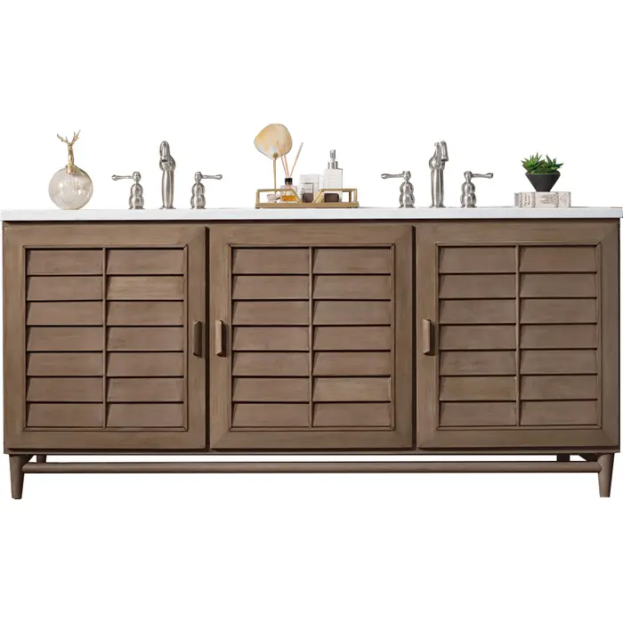 The Portland 72" Whitewashed Walnut Double Vanity features soft-close hinges on doors, with undermount soft-close slides on drawers and concealed ample storage. A proportionate and complementary design with wood knobs and brushed aluminum interior drawers. The look is completed with a 3 CM eased edge Arctic Fall Solid Surface top and two white ceramic rectangular sinks.Three door Whitewashed Walnut double vanity with ten interior drawers and shelf spaceHardware Finish: Whitewashed Walnut (Wood)Solid kiln-dried Grade A hardwoodCabinet is finished inside and out with a premium undercoat finish for superior moisture and UV resistanceSoft-close undermount drawer glides and soft-close door hingesDrawer bottoms are lined with our signature brushed aluminum laminateOne bamboo drawer organizer3 CM eased edge Arctic Fall Solid Surface top and two white porcelain rectangular sinksCountertop is pre-drilled for two 3-hole 8" spreadsFaucets sold separatelyThoroughly Modern. Inspired by the American design aesthetic prevalent from the mid 1930’s through the mid 1960’s; James Martin’s Portland Collection relies on pleasing proportions and simple, modern lines. The cabinets’ stylized, louver doors, conceal ample storage and, with a multitude of drawers - elements of organization. The two finish colors are James Martin’s most popular as well; Burnished Mahogany and Whitewashed Walnut. Our coordinating 28” Mirrors were designed to compliment all cabinet sizes.1 year warranty against manufacturer's defects. We will repair or replace any defective product, if the product is defective in material or workmanship at our discretion. No warranty is expressed or implied regarding damages resulting from consumer misuse.