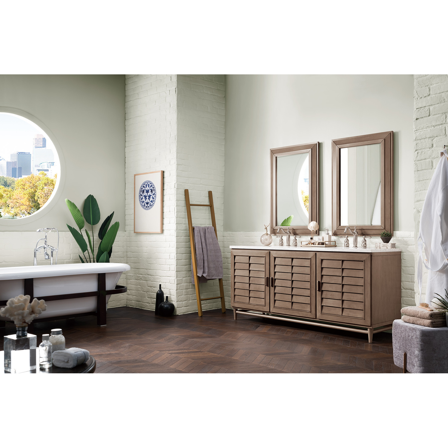 - Thoroughly Modern. Inspired by the American design aesthetic prevalent from the mid 1930’s through the mid 1960’s; James Martin’s Portland Collection relies on pleasing proportions and simple, modern lines. The cabinets’ stylized, louver doors, conceal ample storage and, with a multitude of drawers - elements of organization. The two finish colors are James Martin’s most popular as well; Burnished Mahogany and Whitewashed Walnut. Our coordinating 28” Mirrors were designed to compliment all cabinet sizes.