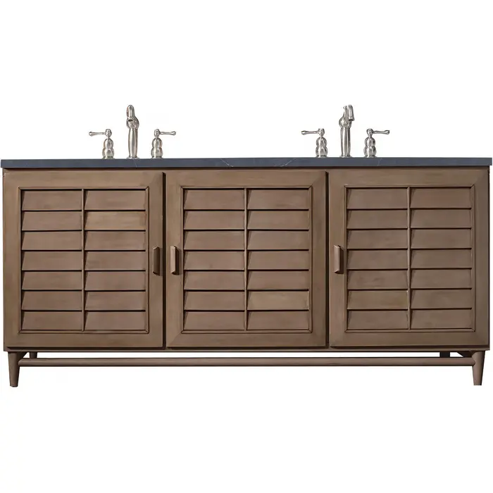 The Portland 72" Whitewashed Walnut Double Vanity features soft-close hinges on doors, with undermount soft-close slides on drawers and concealed ample storage. A proportionate and complementary design with wood knobs and brushed aluminum interior drawers. The look is completed with a 3 CM eased edge Charcoal Soapstone Silestone top and two white ceramic rectangular sinks.Three door Whitewashed Walnut double vanity with ten interior drawers and shelf spaceHardware Finish: Whitewashed Walnut (Wood)Solid kiln-dried Grade A hardwoodCabinet is finished inside and out with a premium undercoat finish for superior moisture and UV resistanceSoft-close undermount drawer glides and soft-close door hingesDrawer bottoms are lined with our signature brushed aluminum laminateOne bamboo drawer organizer3 CM eased edge Charcoal Soapstone Silestone top and two white porcelain rectangular sinksCountertop is pre-drilled for two 3-hole 8" spreadsFaucets sold separatelyThoroughly Modern. Inspired by the American design aesthetic prevalent from the mid 1930’s through the mid 1960’s; James Martin’s Portland Collection relies on pleasing proportions and simple, modern lines. The cabinets’ stylized, louver doors, conceal ample storage and, with a multitude of drawers - elements of organization. The two finish colors are James Martin’s most popular as well; Burnished Mahogany and Whitewashed Walnut. Our coordinating 28” Mirrors were designed to compliment all cabinet sizes.1 year warranty against manufacturer's defects. We will repair or replace any defective product, if the product is defective in material or workmanship at our discretion. No warranty is expressed or implied regarding damages resulting from consumer misuse.