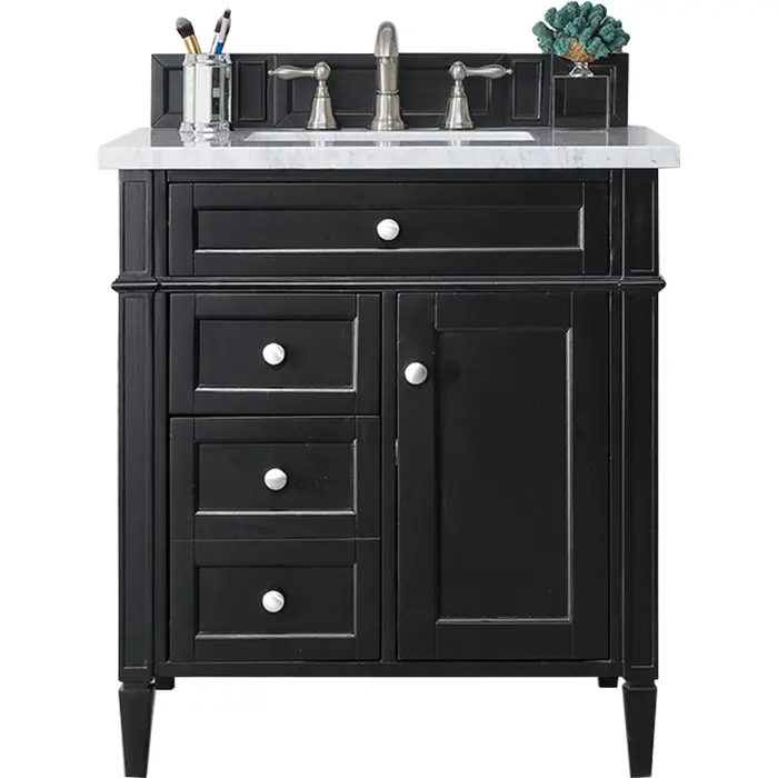 The Brittany 30" Black Onyx Single Vanity by James Martin Vanities features classic details that bridge both traditional and transitional styles. This beautiful piece of furniture includes one hide-away tip-out, top row drawer plus two full-depth side drawers, one of which is double-height for storage of taller items. This cabinet also has one door, which conceals an interior shelf for ample storage, and a bamboo drawer organizer. Handcrafted in yellow poplar solids and veneers with satin nickel hardware. Matching wood backsplash is included. The look is completed with a 3 CM eased edge Carrara Marble top and white ceramic rectangular sink.One door Black Onyx single vanity with three drawers and interior shelf space; lower drawer is double-height; top drawer is tip-out styleHardware Finish: Satin NickelSolid kiln-dried Grade A hardwoodCabinet is finished inside and out with a premium undercoat finish for superior moisture and UV resistanceSoft-close undermount drawer glides and soft-close door hingesDrawer bottoms are lined with our signature brushed aluminum laminateMatching decorative wood backsplash is included3 CM eased edge Carrara Marble top and one white porcelain rectangular sinkCountertop is pre-drilled for one 3-hole 8" spreadFaucet sold separatelyOur most popular collection, the Brittany was thoughtfully crafted to combine both traditional and modern style. The tapered legs are a recognizable nod to the past, while the straight lines and shaker-style detailing suggest a more contemporary aesthetic. Available in eight beautiful finishes, Brittany's versatile design blends seamlessly with a wide range of interior styling, while the expansive storage options make this collection a functional solution for any bathroom.1 year warranty against manufacturer's defects. We will repair or replace any defective product, if the product is defective in material or workmanship at our discretion. No warranty is expressed or implied regarding damages resulting from consumer misuse.