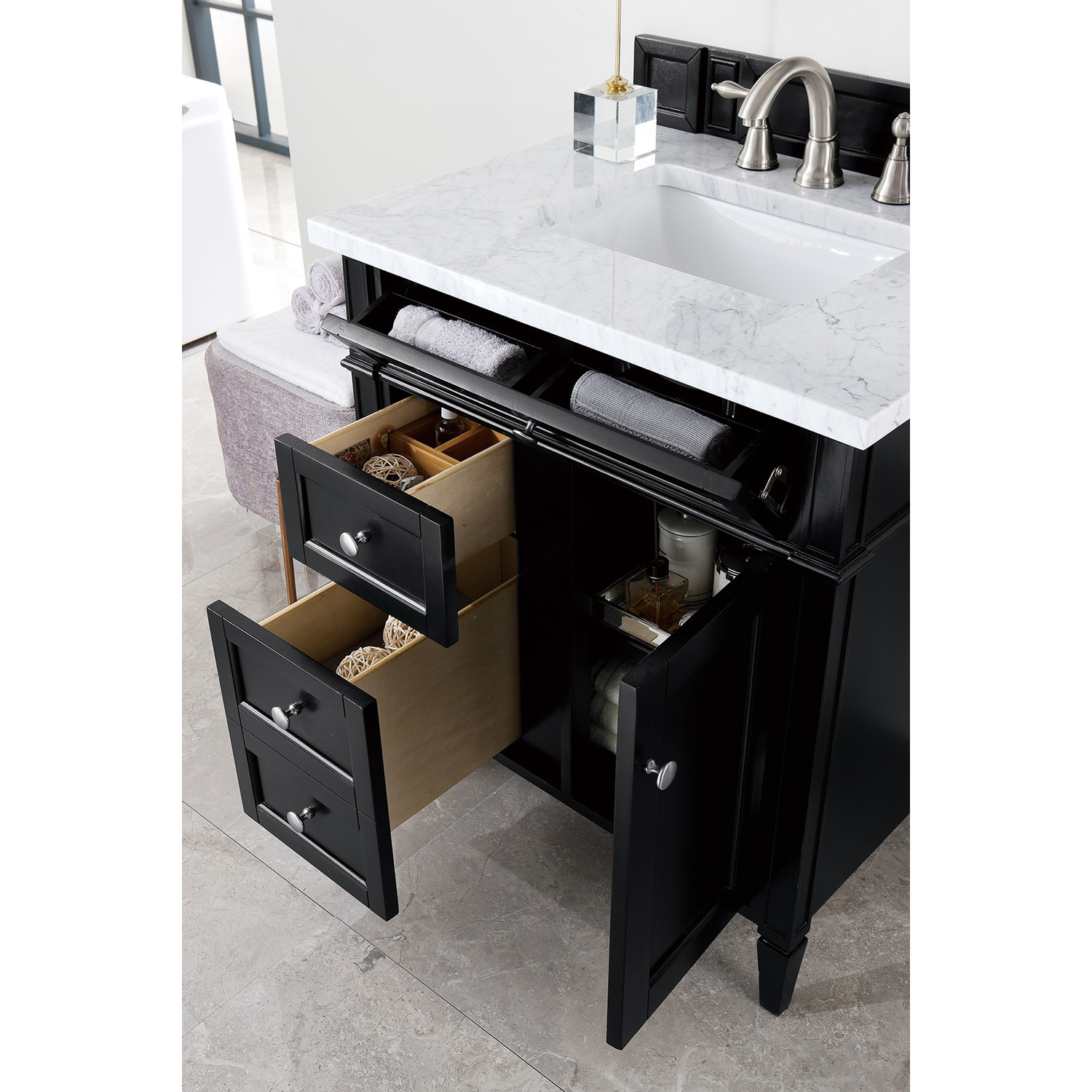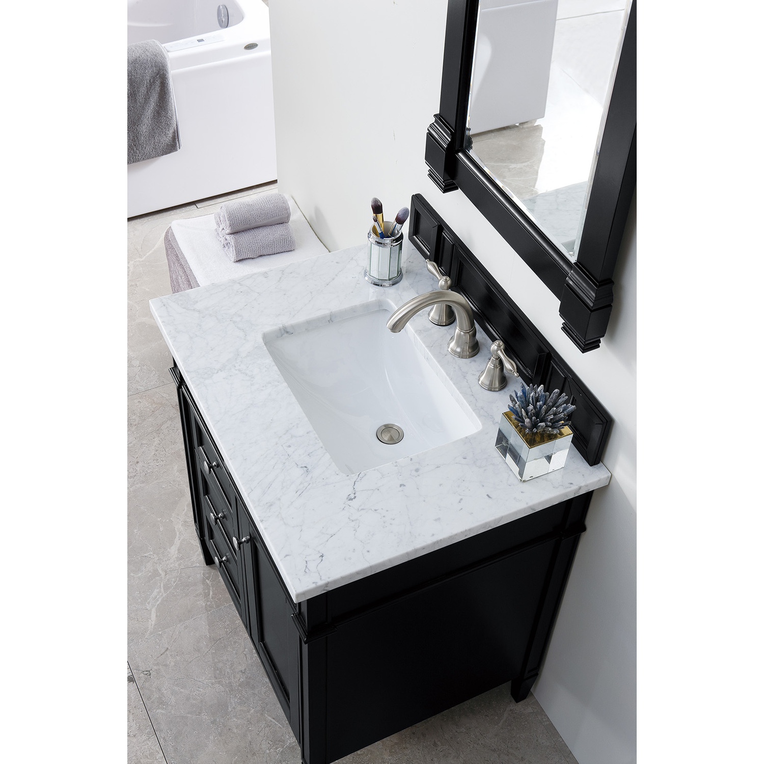 James Martin Brittany 30 inch Single Bathroom Vanity, Black Onyx w/ 3 CM Carrara Marble Top 650-V30-BKO-3CAR