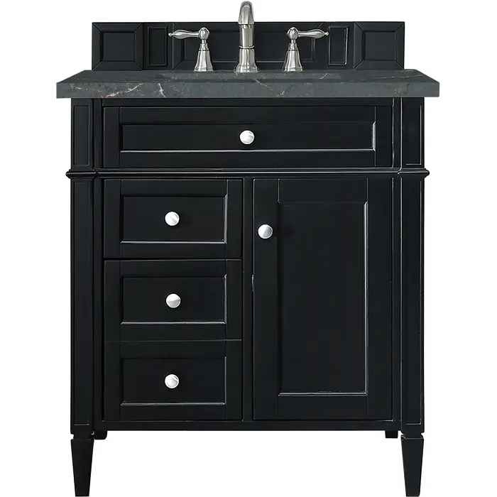 The Brittany 30" Black Onyx Single Vanity by James Martin Vanities features classic details that bridge both traditional and transitional styles. This beautiful piece of furniture includes one hide-away tip-out, top row drawer plus two full-depth side drawers, one of which is double-height for storage of taller items. This cabinet also has one door, which conceals an interior shelf for ample storage, and a bamboo drawer organizer. Handcrafted in yellow Poplar solids and veneers with satin nickel hardware. Matching wood backsplash is included. The look is completed with a 3 CM eased-edge countertop by Cosentino in Parisien Bleu, featuring intricate neutral veining and striking coppery accents coursing through deep blue hues. It includes pre-drilled holes for an 8-inch widespread faucet (not included), one white porcelain rectangular sink, as well as the appropriate mounting brackets for installation.Vanity set includes a 3cm eased edge Parisien Bleu Silestone top, which includes one white porcelain rectangular undermount sink that ships separately, as well as mounting brackets for easy installation. The top is pre-drilled for an 8" widespread faucet.One door Black Onyx single vanity with three drawers and interior shelf space; lower drawer is double-height; top drawer is tip-out styleCrafted from Poplar solids and plywood and is sealed inside and outside with our premium moisture and UV resistant coatingDrawer boxes are constructed using English Dovetail joinery, feature soft-close undermount glides and a Brushed Aluminum laminate drawer bottom.Satin Nickel HardwareIncludes one removable Bamboo drawer organizer trayMatching decorative wood backsplash is includedFaucet sold separatelyCountertop is pre-drilled for one 3-hole 8" spreadOur most popular collection, the Brittany was thoughtfully crafted to combine both traditional and modern style. The tapered legs are a recognizable nod to the past, while the straight lines and shaker-style detailing suggest a more contemporary aesthetic. Available in eight beautiful finishes, Brittany's versatile design blends seamlessly with a wide range of interior styling, while the expansive storage options make this collection a functional solution for any bathroom.1 year warranty against manufacturer's defects. We will repair or replace any defective product, if the product is defective in material or workmanship at our discretion. No warranty is expressed or implied regarding damages resulting from consumer misuse.