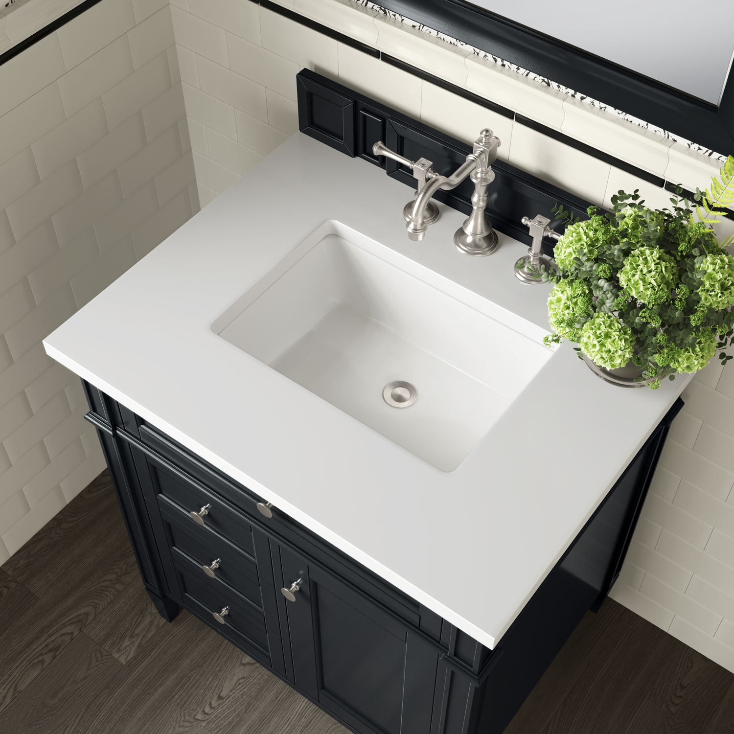 - Subtle luxury. James Martin Vanities most popular collection, Brittany, was designed to merge traditional and transitional tastes. The tapered legs are a nod to the past, but the restrained use of ornamentation suggests a modern aesthetic. Interior space and storage are ample, including our top row “tip out” drawers which utilize the space in front of the sink. Cabinets are crafted from kiln-dried North American Birch and White Poplar hardwoods. Seven widths of cabinet are offered in the Brittany series and are available in six finish options: Burnished Mahogany, Bright White, Urban Gray, Black Onyx, Saddle Brown and Sage Green. Three widths of coordinating mirrors will add finishing touches to your room.