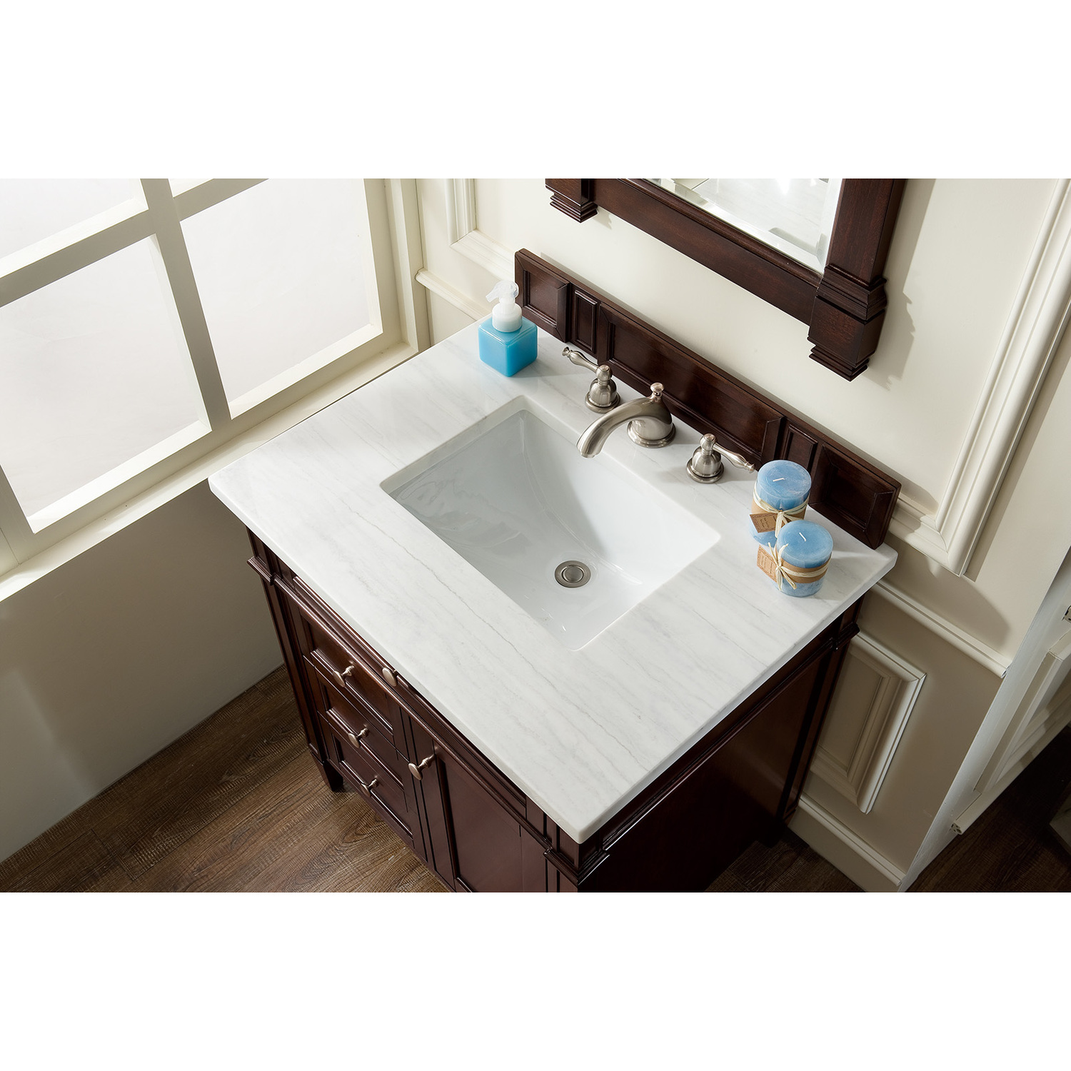 James Martin Brittany 30 inch Single Bathroom Vanity, Burnished Mahogany w/ 3 CM Arctic Fall Solid Surface Top 650-V30-BNM-3AF