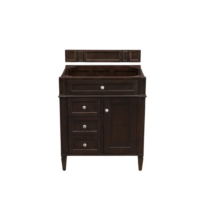 The Brittany 30" Burnished Mahogany Single Vanity by James Martin Vanities features classic details that bridge both traditional and transitional styles. This beautiful piece of furniture includes one hide-away tip-out, top row drawer plus two full-depth side drawers, one of which is double-height for storage of taller items. This cabinet also has one door, which conceals an interior shelf, for ample storage, and a bamboo drawer organizer. Handcrafted in yellow poplar solids and veneers with satin nickel hardware. Matching wood backsplash is included.One door Burnished Mahogany single vanity cabinet with three drawers and interior shelf space; lower drawer is double-height; top drawer is tip-out styleHardware Finish: Satin NickelSolid kiln-dried Grade A hardwoodCabinet is finished inside and out with a premium undercoat finish for superior moisture and UV resistanceSoft-close undermount drawer glides and soft-close door hingesDrawer bottoms are lined with our signature brushed aluminum laminateMatching decorative wood backsplash is includedCabinet only, countertop and sink not includedOur most popular collection, the Brittany was thoughtfully crafted to combine both traditional and modern style. The tapered legs are a recognizable nod to the past, while the straight lines and shaker-style detailing suggest a more contemporary aesthetic. Available in eight beautiful finishes, Brittany's versatile design blends seamlessly with a wide range of interior styling, while the expansive storage options make this collection a functional solution for any bathroom.1 year warranty against manufacturer's defects. We will repair or replace any defective product, if the product is defective in material or workmanship at our discretion. No warranty is expressed or implied regarding damages resulting from consumer misuse.