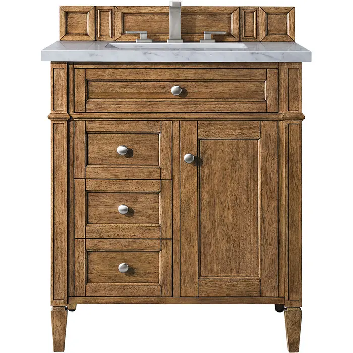 James Martin Brittany 30 inch Single Bathroom Vanity, Saddle Brown w/ 3 CM Carrara Marble Top 650-V30-SBR-3CAR