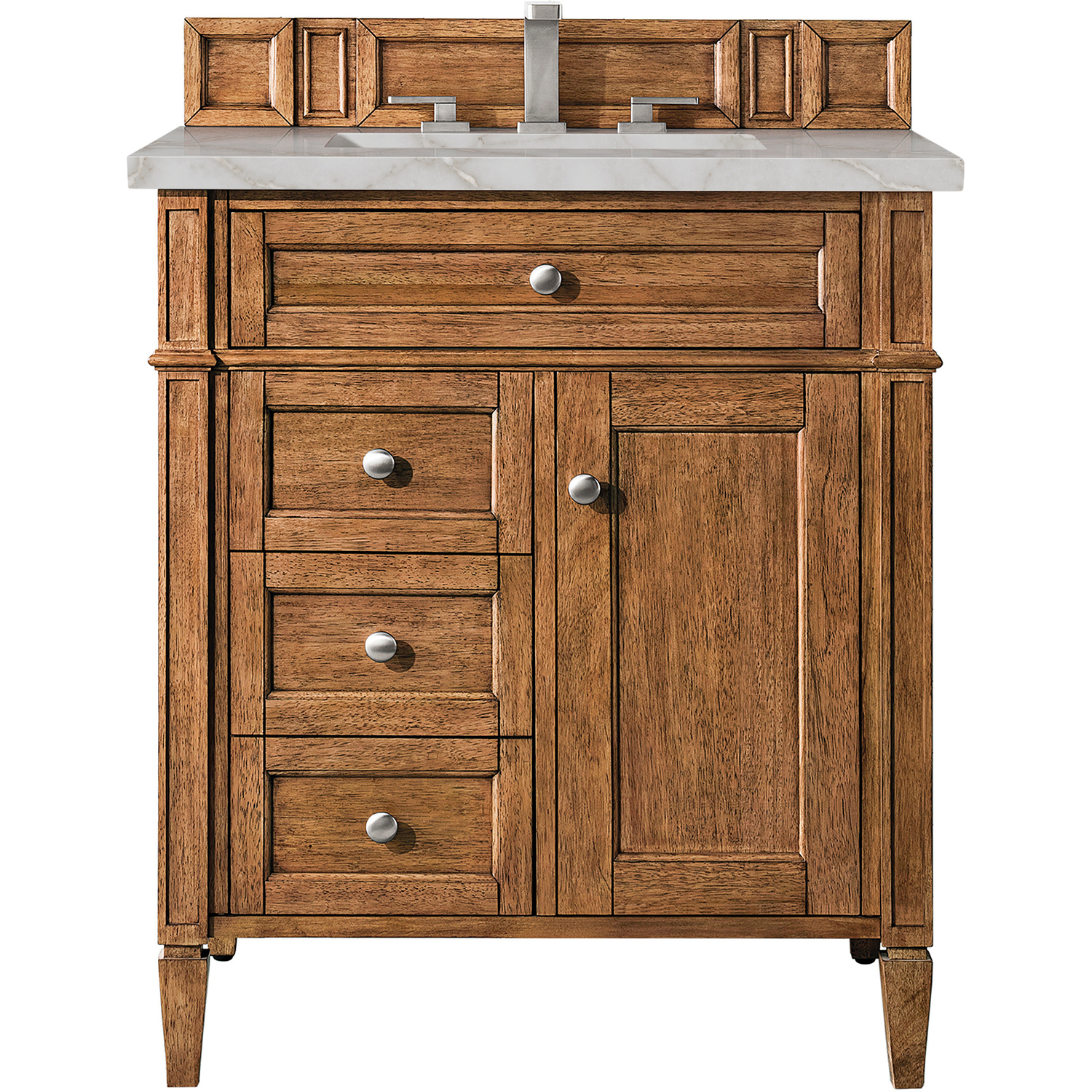 The Brittany 30" Saddle Brown Single Vanity by James Martin Vanities features classic details that bridge both traditional and transitional styles. This beautiful piece of furniture includes one hide-away tip-out, top row drawer plus two full-depth side drawers, one of which is double-height for storage of taller items. This cabinet also has one door, which conceals an interior shelf for ample storage, and a bamboo drawer organizer. Handcrafted in yellow Poplar solids and veneers with satin nickel hardware. Matching wood backsplash is included. The look is completed with a 3 CM eased-edge countertop by Cosentino in Victorian Silver, which features a cool background tone with silver and dark neutral veins, complimented with champagne metallic accents. It includes pre-drilled holes for an 8-inch widespread faucet (not included), one white porcelain rectangular sink, as well as the appropriate mounting brackets for installation.Vanity set includes a 3cm eased edge Victorian Silver Silestone top, a white porcelain rectangular sink and mounting brackets for easy installation. Top is pre-drilled for an 8" widespread faucet. Faucet not included.One door Saddle Brown single vanity with three drawers and interior shelf space; lower drawer is double-height; top drawer is tip-out styleCrafted from Poplar solids and plywood and is sealed inside and outside with our premium moisture and UV resistant coatingDrawer boxes are constructed using English Dovetail joinery, feature soft-close undermount glides and a Brushed Aluminum laminate drawer bottom.Satin Nickel HardwareIncludes one removable Bamboo drawer organizer trayMatching decorative wood backsplash is includedFaucet sold separatelyCountertop is pre-drilled for one 3-hole 8" spreadSubtle luxury. James Martin Vanities most popular collection, Brittany, was designed to merge traditional and transitional tastes. The tapered legs are a nod to the past, but the restrained use of ornamentation suggests a modern aesthetic. Interior space and storage are ample, including our top row “tip out” drawers which utilize the space in front of the sink. Cabinets are crafted from kiln-dried North American Birch and White Poplar hardwoods. Seven widths of cabinet are offered in the Brittany series and are available in six finish options: Burnished Mahogany, Bright White, Urban Gray, Black Onyx, Saddle Brown and Sage Green. Three widths of coordinating mirrors will add finishing touches to your room.1 year warranty against manufacturer's defects. We will repair or replace any defective product, if the product is defective in material or workmanship at our discretion. No warranty is expressed or implied regarding damages resulting from consumer misuse.