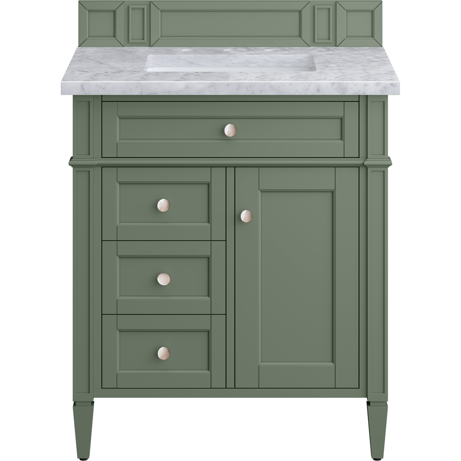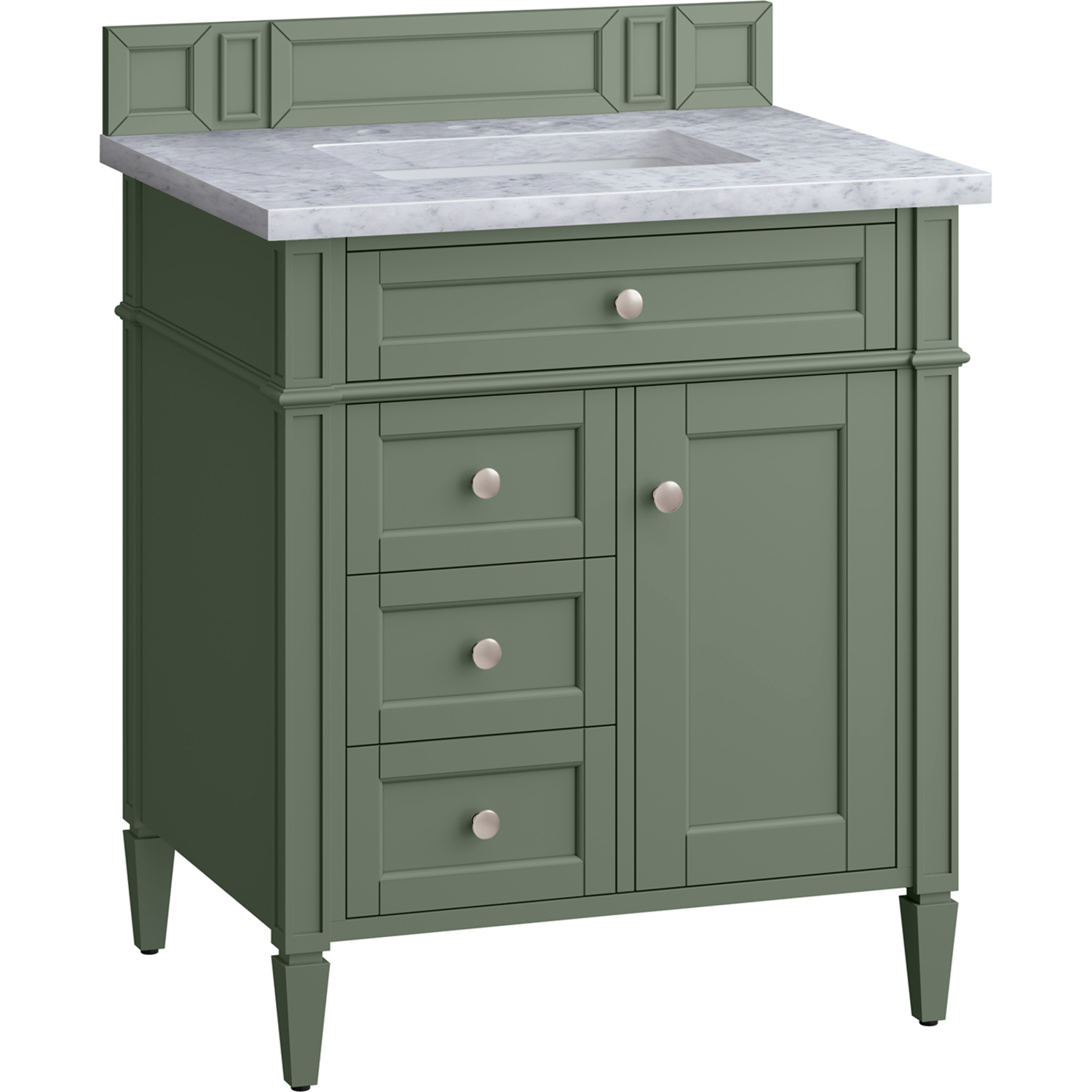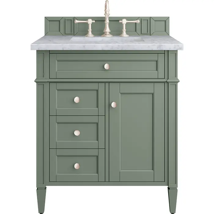 The Smokey Celadon finish on the 30" Brittany Vanity adds a refreshing, natural element to any bathroom space. This moody, yet muted green, with subtle blue and grey undertones, brings the rich, timeless details of the Brittany collection to life. The 30" cabinet, with decorative wood backsplash, features optimal organization with one hide-away tip-out drawer plus two side drawers, one of which is a double height for storing taller items while the other contains a removable bamboo organizer tray. This cabinet also has one door, which conceals an interior shelf. All drawers are lined with an aluminum laminate surface for easy cleaning and are equipped with undermount soft-close slides. The natural Spanish Carrara marble top perfectly complements the green hue and the classic details of the Brittany vanity. All of our 3 CM tops include a porcelain undermount sink.One door Smokey Celadon single vanity with three drawers and interior shelf space; lower drawer is double-height; top drawer is tip-out styleHardware Finish: Satin NickelSolid kiln-dried Grade A hardwoodCabinet is finished inside and out with a premium undercoat finish for superior moisture and UV resistanceSoft-close undermount drawer glides and soft-close door hingesDrawer bottoms are lined with our signature brushed aluminum laminateMatching decorative wood backsplash is included3 CM eased edge Carrara Marble top and one white porcelain rectangular sinkCountertop is pre-drilled for one 3-hole 8" spreadFaucet sold separatelyOur most popular collection, the Brittany was thoughtfully crafted to combine both traditional and modern style. The tapered legs are a recognizable nod to the past, while the straight lines and shaker-style detailing suggest a more contemporary aesthetic. Available in eight beautiful finishes, Brittany's versatile design blends seamlessly with a wide range of interior styling, while the expansive storage options make this collection a functional solution for any bathroom.1 year warranty against manufacturer's defects. We will repair or replace any defective product, if the product is defective in material or workmanship at our discretion. No warranty is expressed or implied regarding damages resulting from consumer misuse.