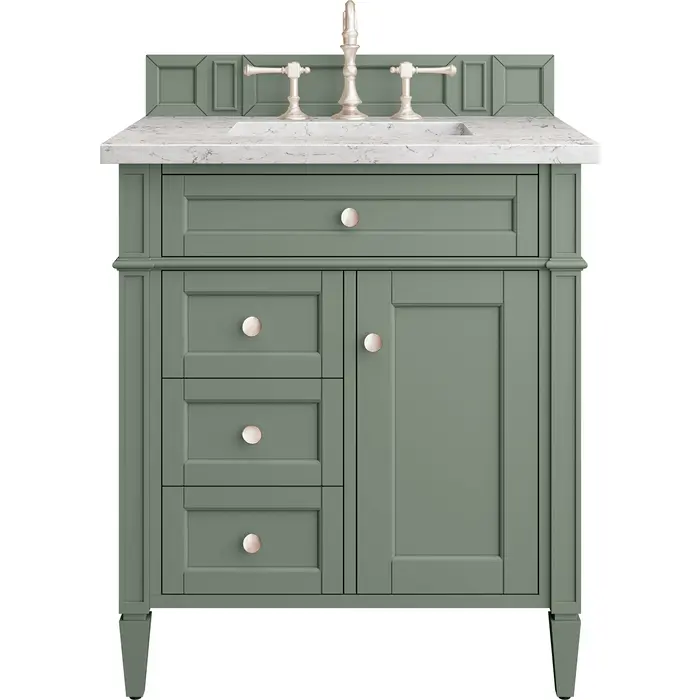 James Martin Brittany 30 inch Single Bathroom Vanity, Smokey Celadon w/ 3 CM Eternal Jasmine Pearl Top 650-V30-SC-3EJP