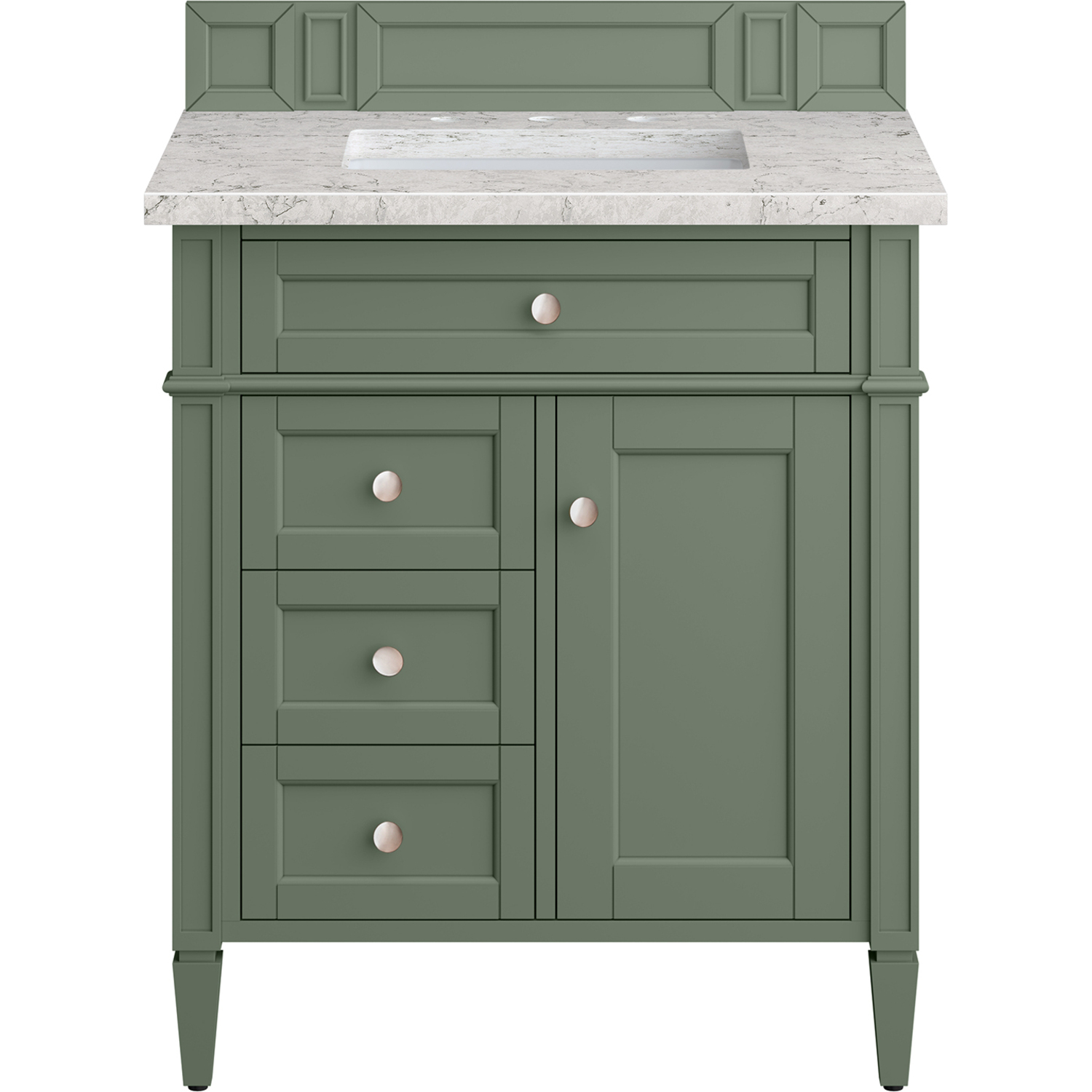 The Smokey Celadon finish on the 30" Brittany Vanity adds a refreshing, natural element to any bathroom space. This moody, yet muted green, with subtle blue and grey undertones, brings the rich, timeless details of the Brittany collection to life. The 30" cabinet, with decorative wood backsplash, features optimal organization with one hide-away tip-out drawer plus two side drawers, one of which is a double height for storing taller items while the other contains a removable bamboo organizer tray. This cabinet also has one door, which conceals an interior shelf. All drawers are lined with an aluminum laminate surface for easy cleaning and are equipped with undermount soft-close slides. The marbleized detail and neutral contrasting hues of the Eternal Jasmine Pearl Silestone top allow for a rich, elegant look. All of our 3 CM tops include a porcelain undermount sink.One door Smokey Celadon single vanity with three drawers and interior shelf space; lower drawer is double-height; top drawer is tip-out styleHardware Finish: Satin NickelSolid kiln-dried Grade A hardwoodCabinet is finished inside and out with a premium undercoat finish for superior moisture and UV resistanceSoft-close undermount drawer glides and soft-close door hingesDrawer bottoms are lined with our signature brushed aluminum laminateMatching decorative wood backsplash is included3 CM eased edge Eternal Jasmine Pearl Silestone top and one white porcelain rectangular sinkCountertop is pre-drilled for one 3-hole 8" spreadFaucet sold separatelyOur most popular collection, the Brittany was thoughtfully crafted to combine both traditional and modern style. The tapered legs are a recognizable nod to the past, while the straight lines and shaker-style detailing suggest a more contemporary aesthetic. Available in eight beautiful finishes, Brittany's versatile design blends seamlessly with a wide range of interior styling, while the expansive storage options make this collection a functional solution for any bathroom.1 year warranty against manufacturer's defects. We will repair or replace any defective product, if the product is defective in material or workmanship at our discretion. No warranty is expressed or implied regarding damages resulting from consumer misuse.