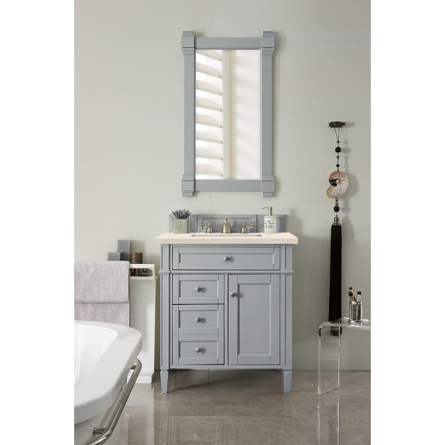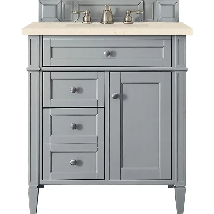 The Brittany 30" Urban Gray Single Vanity by James Martin Vanities features classic details that bridge both traditional and transitional styles. This beautiful piece of furniture includes one hide-away tip-out, top row drawer plus two full-depth side drawers, one of which is double-height for storage of taller items. This cabinet also has one door, which conceals an interior shelf for ample storage, and a bamboo drawer organizer. Handcrafted in yellow poplar solids and veneers with satin nickel hardware. Matching wood backsplash is included. The look is completed with a 3 CM eased edge Eternal Marfil Silestone top by Cosentino and one white ceramic sink.One door Urban Gray single vanity with three drawers and interior shelf space; lower drawer is double-height; top drawer is tip-out styleHardware Finish: Satin NickelSolid kiln-dried Grade A hardwoodCabinet is finished inside and out with a premium undercoat finish for superior moisture and UV resistanceSoft-close undermount drawer glides and soft-close door hingesDrawer bottoms are lined with our signature brushed aluminum laminateMatching decorative wood backsplash is included3 CM eased edge Eternal Marfil Silestone top and one white porcelain rectangular sinkCountertop is pre-drilled for one 3-hole 8" spreadFaucet sold separatelyOur most popular collection, the Brittany was thoughtfully crafted to combine both traditional and modern style. The tapered legs are a recognizable nod to the past, while the straight lines and shaker-style detailing suggest a more contemporary aesthetic. Available in eight beautiful finishes, Brittany's versatile design blends seamlessly with a wide range of interior styling, while the expansive storage options make this collection a functional solution for any bathroom.1 year warranty against manufacturer's defects. We will repair or replace any defective product, if the product is defective in material or workmanship at our discretion. No warranty is expressed or implied regarding damages resulting from consumer misuse.