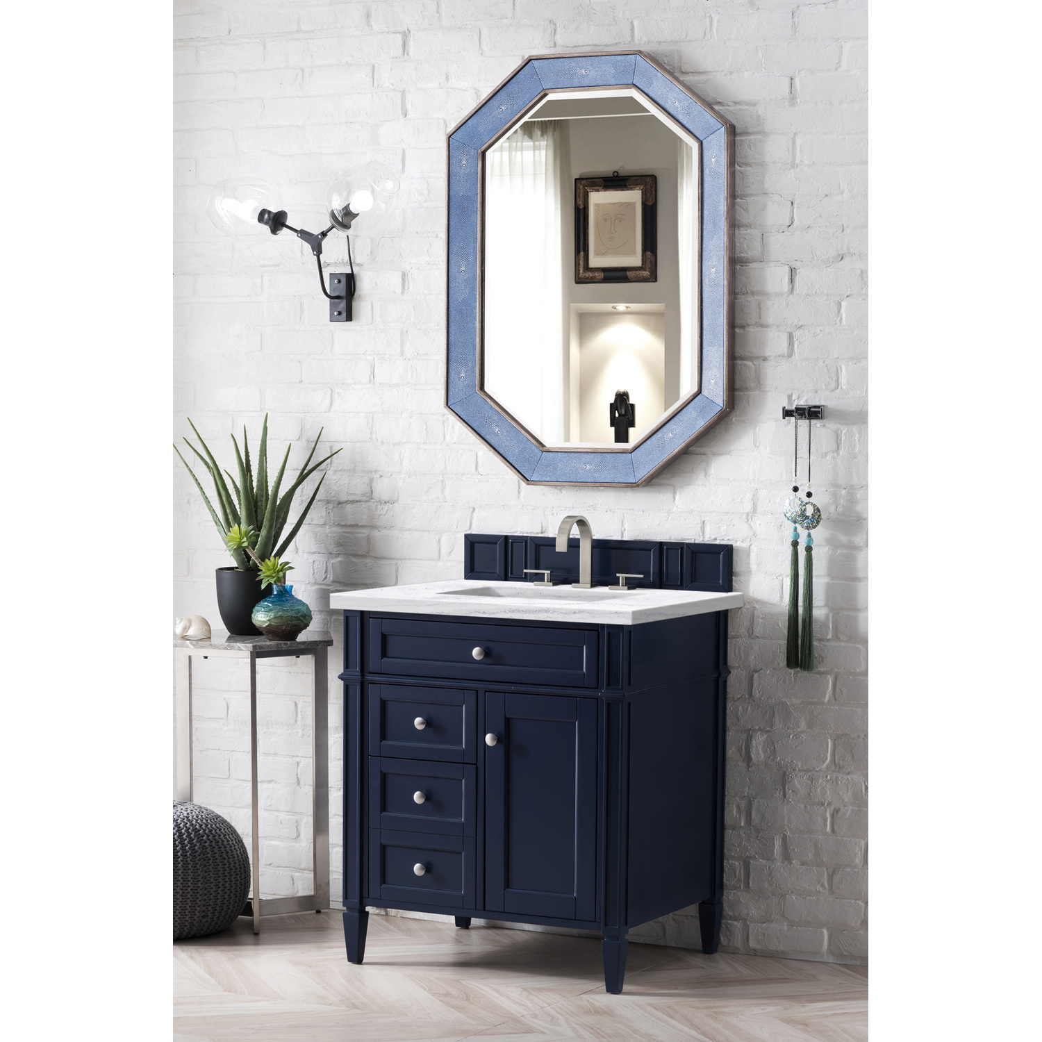 The Brittany 30" Urban Gray Single Vanity by James Martin Vanities features classic details that bridge both traditional and transitional styles. This beautiful piece of furniture includes one hide-away tip-out, top row drawer plus two full-depth side drawers, one of which is double-height for storage of taller items. This cabinet also has one door, which conceals an interior shelf for ample storage, and a bamboo drawer organizer. Handcrafted in yellow poplar solids and veneers with satin nickel hardware. Matching wood backsplash is included. The look is completed with a 3 CM eased edge Arctic Fall Solid Surface top with one white ceramic rectangular sink.One door Victory Blue single vanity with three drawers and interior shelf space; lower drawer is double-height; top drawer is tip-out styleHardware Finish: Satin NickelSolid kiln-dried Grade A hardwoodCabinet is finished inside and out with a premium undercoat finish for superior moisture and UV resistanceSoft-close undermount drawer glides and soft-close door hingesDrawer bottoms are lined with our signature brushed aluminum laminateMatching decorative wood backsplash is included3 CM eased edge Arctic Fall Solid Surface top and one white porcelain rectangular sinkCountertop is pre-drilled for one 3-hole 8" spreadFaucet sold separatelyOur most popular collection, the Brittany was thoughtfully crafted to combine both traditional and modern style. The tapered legs are a recognizable nod to the past, while the straight lines and shaker-style detailing suggest a more contemporary aesthetic. Available in eight beautiful finishes, Brittany's versatile design blends seamlessly with a wide range of interior styling, while the expansive storage options make this collection a functional solution for any bathroom.1 year warranty against manufacturer's defects. We will repair or replace any defective product, if the product is defective in material or workmanship at our discretion. No warranty is expressed or implied regarding damages resulting from consumer misuse.