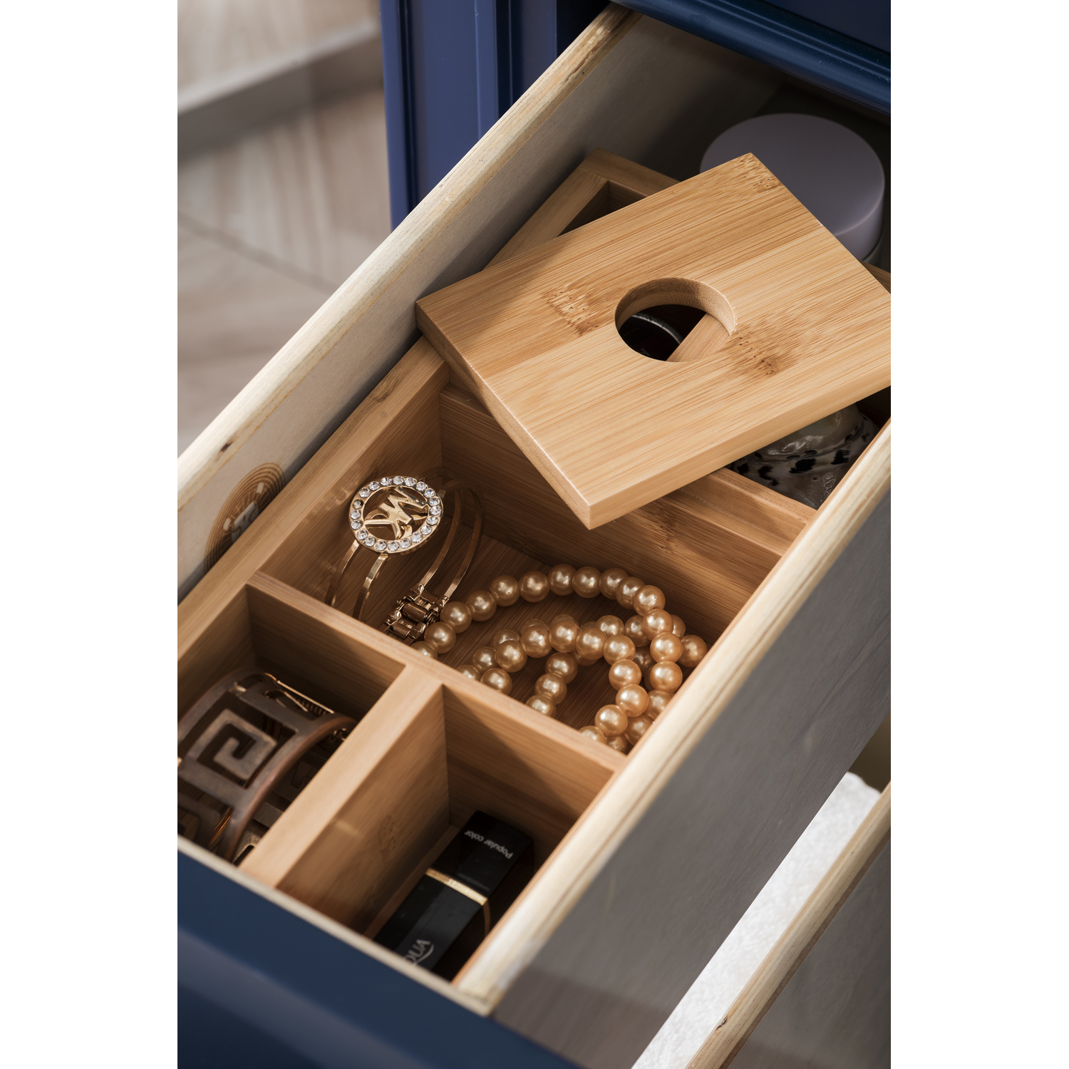 - Soft-close undermount drawer glides and soft-close door hinges