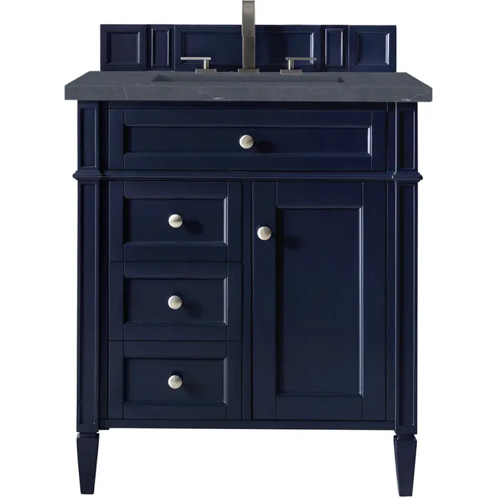 The Brittany 30" Urban Gray Single Vanity by James Martin Vanities features classic details that bridge both traditional and transitional styles. This beautiful piece of furniture includes one hide-away tip-out, top row drawer plus two full-depth side drawers, one of which is double-height for storage of taller items. This cabinet also has one door, which conceals an interior shelf for ample storage, and a bamboo drawer organizer. Handcrafted in yellow poplar solids and veneers with satin nickel hardware. Matching wood backsplash is included. The look is completed with a 3 CM eased edge Charcoal Soapstone Silestone top by Cosentino and one white ceramic sink.One door Victory Blue single vanity with three drawers and interior shelf space; lower drawer is double-height; top drawer is tip-out styleHardware Finish: Satin NickelSolid kiln-dried Grade A hardwoodCabinet is finished inside and out with a premium undercoat finish for superior moisture and UV resistanceSoft-close undermount drawer glides and soft-close door hingesDrawer bottoms are lined with our signature brushed aluminum laminateMatching decorative wood backsplash is included3 CM eased edge Charcoal Soapstone Silestone top and one white porcelain rectangular sinkCountertop is pre-drilled for one 3-hole 8" spreadFaucet sold separatelyOur most popular collection, the Brittany was thoughtfully crafted to combine both traditional and modern style. The tapered legs are a recognizable nod to the past, while the straight lines and shaker-style detailing suggest a more contemporary aesthetic. Available in eight beautiful finishes, Brittany's versatile design blends seamlessly with a wide range of interior styling, while the expansive storage options make this collection a functional solution for any bathroom.1 year warranty against manufacturer's defects. We will repair or replace any defective product, if the product is defective in material or workmanship at our discretion. No warranty is expressed or implied regarding damages resulting from consumer misuse.