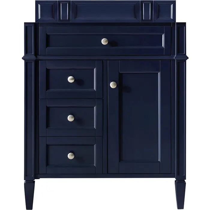 The Brittany 30" Victory Blue Single Vanity by James Martin Vanities features classic details that bridge both traditional and transitional styles.  This beautiful piece of furniture includes one hide-away tip-out, top row drawer plus two full-depth side drawers, one of which is double-height for storage of taller items.  This cabinet also has one door, which conceals an interior shelf, for ample storage, and a bamboo drawer organizer. Handcrafted in yellow poplar solids and veneers with satin nickel hardware.  Matching wood backsplash is included.One door Victory Blue single vanity cabinet with three drawers and interior shelf space; lower drawer is double-height; top drawer is tip-out styleHardware Finish: Satin NickelSolid kiln-dried Grade A hardwoodCabinet is finished inside and out with a premium undercoat finish for superior moisture and UV resistanceSoft-close undermount drawer glides and soft-close door hingesDrawer bottoms are lined with our signature brushed aluminum laminateMatching decorative wood backsplash is includedCabinet only, countertop and sink not includedOur most popular collection, the Brittany was thoughtfully crafted to combine both traditional and modern style. The tapered legs are a recognizable nod to the past, while the straight lines and shaker-style detailing suggest a more contemporary aesthetic. Available in eight beautiful finishes, Brittany's versatile design blends seamlessly with a wide range of interior styling, while the expansive storage options make this collection a functional solution for any bathroom.1 year warranty against manufacturer's defects. We will repair or replace any defective product, if the product is defective in material or workmanship at our discretion. No warranty is expressed or implied regarding damages resulting from consumer misuse.