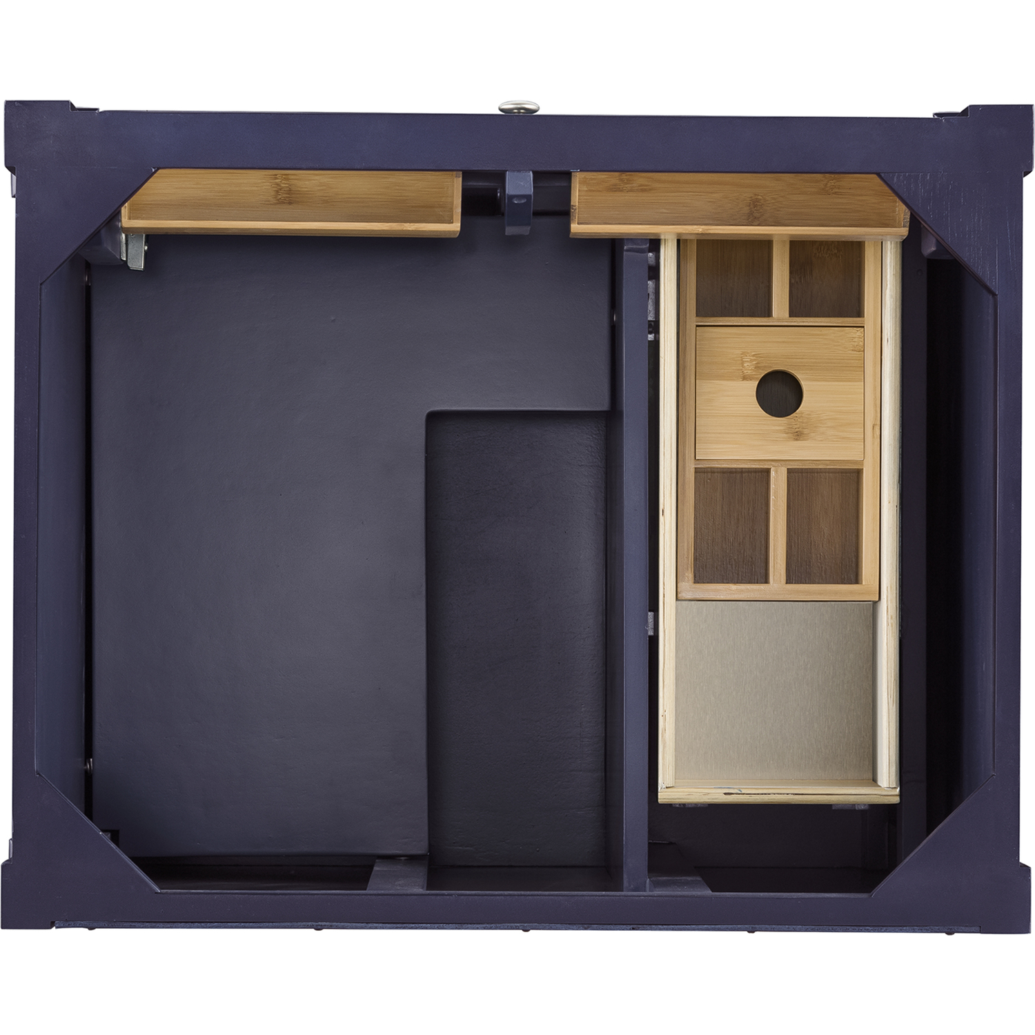 • One door Victory Blue single vanity cabinet with three drawers and interior shelf space; lower drawer is double-height; top drawer is tip-out style