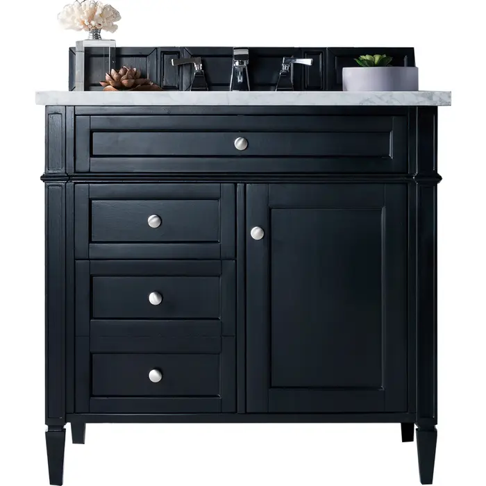 The Brittany 36" Black Onyx Single Vanity by James Martin Vanities features classic details that bridge both traditional and transitional styles. This beautiful piece of furniture includes one hide-away tip-out, top row drawer plus two full-depth side drawers, one of which is double-height for storage of taller items. This cabinet also has one door, which conceals an interior shelf for ample storage. Handcrafted in yellow poplar solids and veneers with satin nickel hardware. Matching wood backsplash is included. The look is completed with a 3 CM eased edge Eternal Jasmine Pearl Silestone top by Cosentino and one white ceramic sink.One door Black Onyx single vanity with three drawers and interior shelf space; lower drawer is double-height; top drawer is tip-out styleHardware Finish: Satin NickelSolid kiln-dried Grade A hardwoodCabinet is finished inside and out with a premium undercoat finish for superior moisture and UV resistanceSoft-close undermount drawer glides and soft-close door hingesDrawer bottoms are lined with our signature brushed aluminum laminateMatching decorative wood backsplash is included3 CM eased edge Eternal Jasmine Pearl Silestone top and one white porcelain rectangular sinkCountertop is pre-drilled for one 3-hole 8" spreadFaucet sold separatelyOur most popular collection, the Brittany was thoughtfully crafted to combine both traditional and modern style. The tapered legs are a recognizable nod to the past, while the straight lines and shaker-style detailing suggest a more contemporary aesthetic. Available in eight beautiful finishes, Brittany's versatile design blends seamlessly with a wide range of interior styling, while the expansive storage options make this collection a functional solution for any bathroom.1 year warranty against manufacturer's defects. We will repair or replace any defective product, if the product is defective in material or workmanship at our discretion. No warranty is expressed or implied regarding damages resulting from consumer misuse.