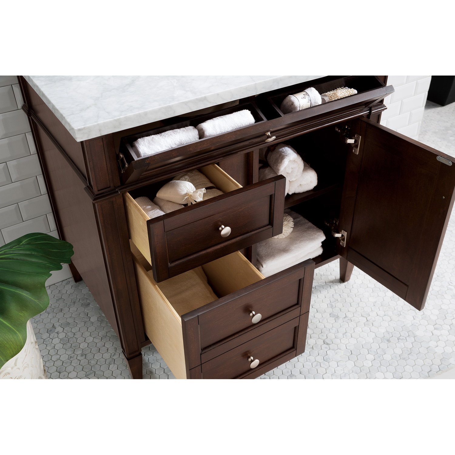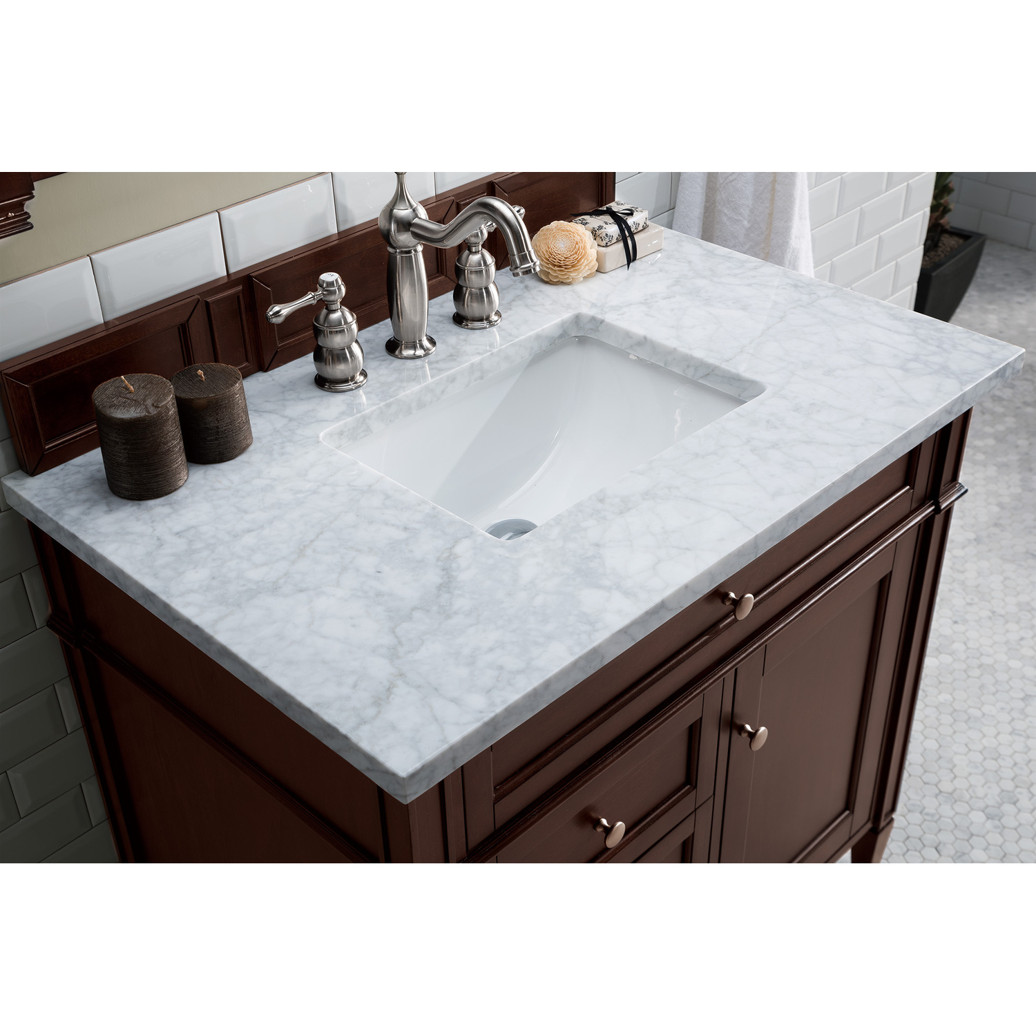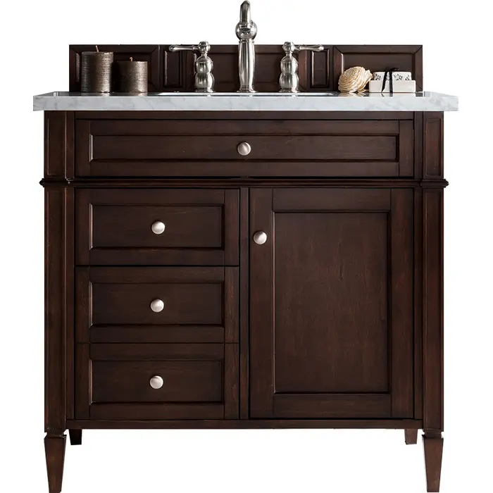 The Brittany 36" Burnished Mahogany Single Vanity by James Martin Vanities features classic details that bridge both traditional and transitional styles. This beautiful piece of furniture includes one hide-away tip-out, top row drawer plus two full-depth side drawers, one of which is double-height for storage of taller items. This cabinet also has one door, which conceals an interior shelf for ample storage. Handcrafted in yellow poplar solids and veneers with satin nickel hardware. Matching wood backsplash is included. The look is completed with a 3 CM eased edge Carrara Marble top and white ceramic rectangular sink.One door Burnished Mahogany single vanity with three drawers and interior shelf space; lower drawer is double-height; top drawer is tip-out styleHardware Finish: Satin NickelSolid kiln-dried Grade A hardwoodCabinet is finished inside and out with a premium undercoat finish for superior moisture and UV resistanceSoft-close undermount drawer glides and soft-close door hingesDrawer bottoms are lined with our signature brushed aluminum laminateMatching decorative wood backsplash is included3 CM eased edge Carrara Marble top and one white porcelain rectangular sinkCountertop is pre-drilled for one 3-hole 8" spreadFaucet sold separatelyOur most popular collection, the Brittany was thoughtfully crafted to combine both traditional and modern style. The tapered legs are a recognizable nod to the past, while the straight lines and shaker-style detailing suggest a more contemporary aesthetic. Available in eight beautiful finishes, Brittany's versatile design blends seamlessly with a wide range of interior styling, while the expansive storage options make this collection a functional solution for any bathroom.1 year warranty against manufacturer's defects. We will repair or replace any defective product, if the product is defective in material or workmanship at our discretion. No warranty is expressed or implied regarding damages resulting from consumer misuse.