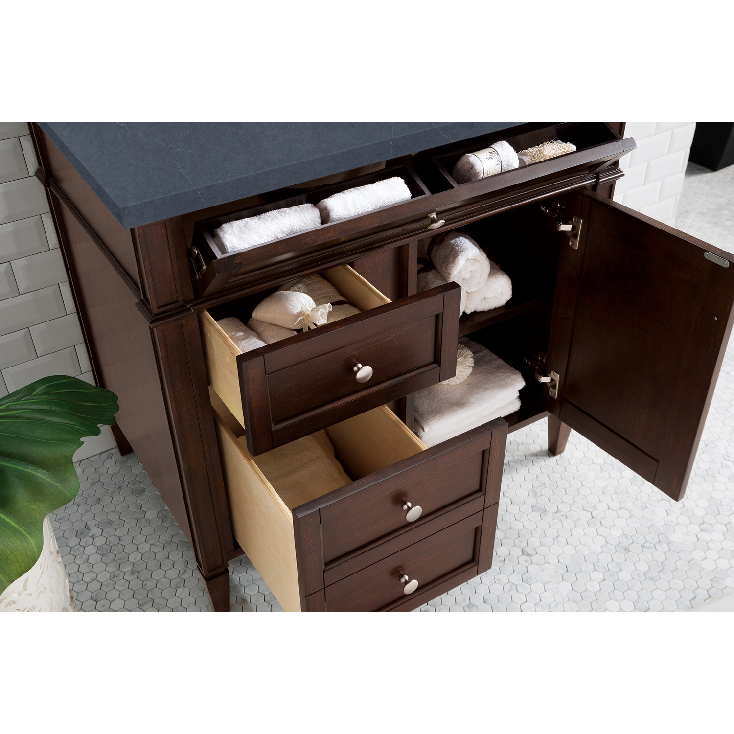 The Brittany 36" Burnished Mahogany Single Vanity by James Martin Vanities features classic details that bridge both traditional and transitional styles. This beautiful piece of furniture includes one hide-away tip-out, top row drawer plus two full-depth side drawers, one of which is double-height for storage of taller items. This cabinet also has one door, which conceals an interior shelf for ample storage. Handcrafted in yellow poplar solids and veneers with satin nickel hardware. Matching wood backsplash is included. The look is completed with a 3 CM eased edge Charcoal Soapstone Silestone top by Cosentino and one white ceramic sink.One door Burnished Mahogany single vanity with three drawers and interior shelf space; lower drawer is double-height; top drawer is tip-out styleHardware Finish: Satin NickelSolid kiln-dried Grade A hardwoodCabinet is finished inside and out with a premium undercoat finish for superior moisture and UV resistanceSoft-close undermount drawer glides and soft-close door hingesDrawer bottoms are lined with our signature brushed aluminum laminateMatching decorative wood backsplash is included3 CM eased edge Charcoal Soapstone Silestone top and one white porcelain rectangular sinkCountertop is pre-drilled for one 3-hole 8" spreadFaucet sold separatelyOur most popular collection, the Brittany was thoughtfully crafted to combine both traditional and modern style. The tapered legs are a recognizable nod to the past, while the straight lines and shaker-style detailing suggest a more contemporary aesthetic. Available in eight beautiful finishes, Brittany's versatile design blends seamlessly with a wide range of interior styling, while the expansive storage options make this collection a functional solution for any bathroom.1 year warranty against manufacturer's defects. We will repair or replace any defective product, if the product is defective in material or workmanship at our discretion. No warranty is expressed or implied regarding damages resulting from consumer misuse.