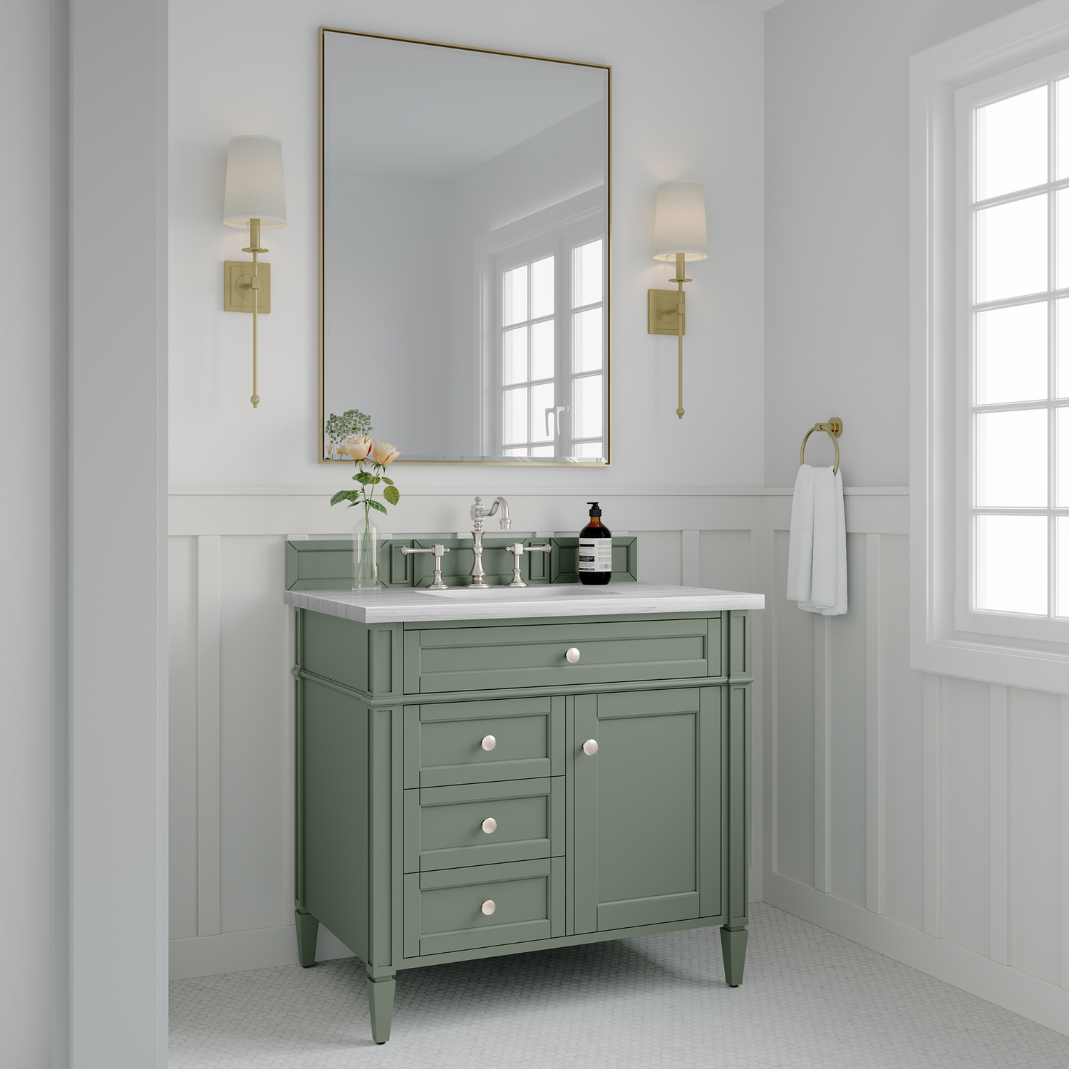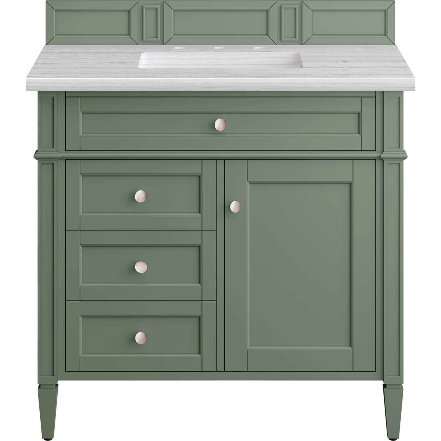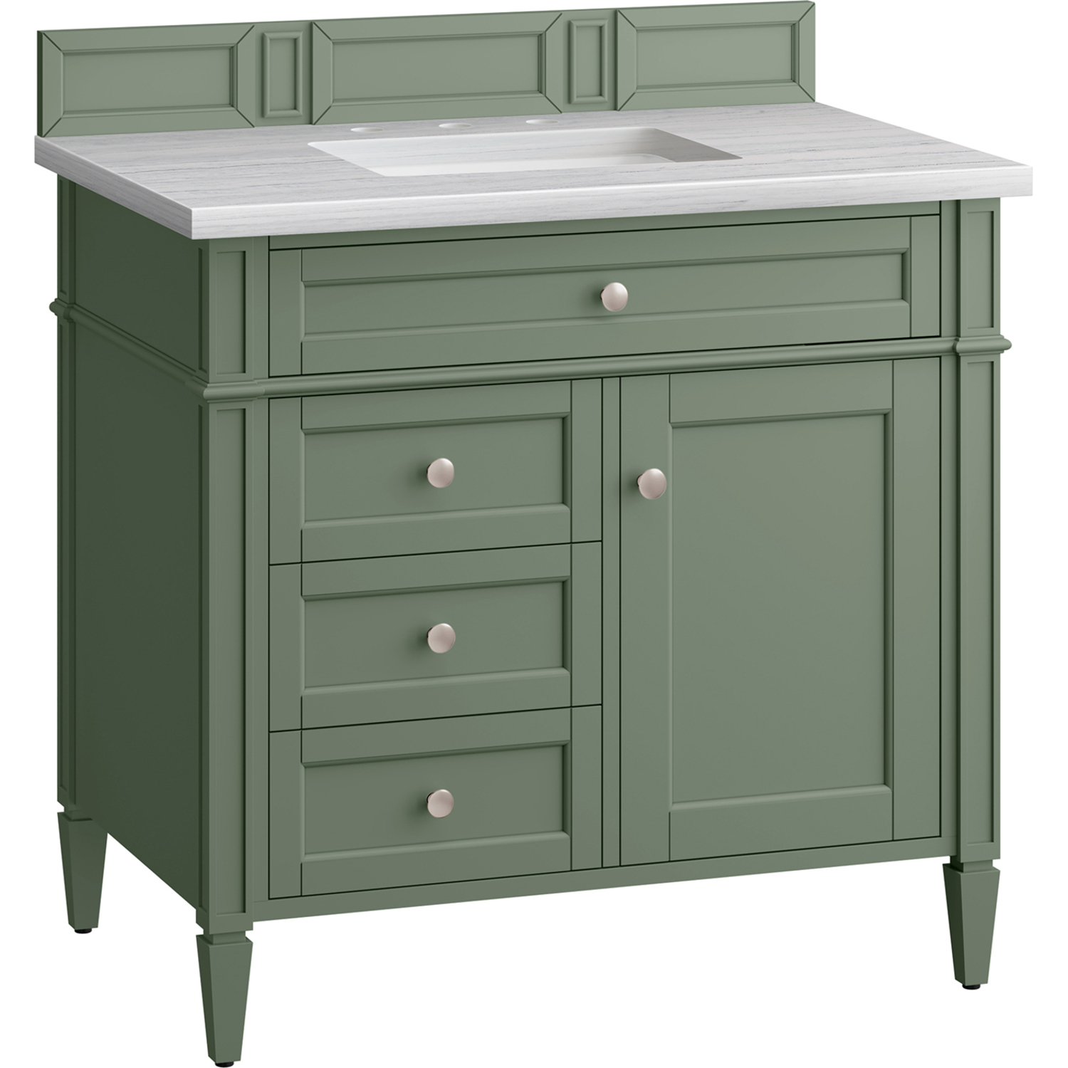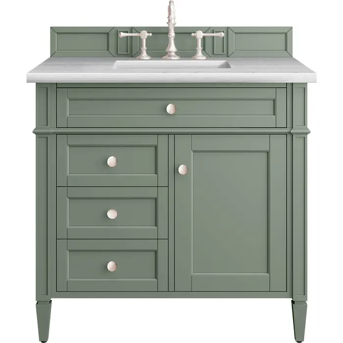 The Smokey Celadon finish on the 36" Brittany Vanity adds a refreshing, natural element to any bathroom space. This moody, yet muted green, with subtle blue and grey undertones, brings the rich, timeless details of the Brittany collection to life. The 36" cabinet, with decorative wood backsplash, features optimal organization with one hide-away tip-out drawer plus two side drawers, one of which is a double height for storing taller items while the other contains a removable bamboo organizer tray. This cabinet also has one door, which conceals an interior shelf. All drawers are lined with an aluminum laminate surface for easy cleaning and are equipped with undermount soft-close slides. The Arctic Fall Solid Surface top adds an exquisite, modern touch with its soft white finish, grey undertones, and a natural-looking greyish horizontal veining. All of our 3 CM tops include a porcelain undermount sink.One door Smokey Celadon single vanity with three drawers and interior shelf space; lower drawer is double-height; top drawer is tip-out styleHardware Finish: Satin NickelSolid kiln-dried Grade A hardwoodCabinet is finished inside and out with a premium undercoat finish for superior moisture and UV resistanceSoft-close undermount drawer glides and soft-close door hingesDrawer bottoms are lined with our signature brushed aluminum laminateMatching decorative wood backsplash is included3 CM eased edge Arctic Fall Solid Surface top and one white porcelain rectangular sinkCountertop is pre-drilled for one 3-hole 8" spreadFaucet sold separatelyOur most popular collection, the Brittany was thoughtfully crafted to combine both traditional and modern style. The tapered legs are a recognizable nod to the past, while the straight lines and shaker-style detailing suggest a more contemporary aesthetic. Available in eight beautiful finishes, Brittany's versatile design blends seamlessly with a wide range of interior styling, while the expansive storage options make this collection a functional solution for any bathroom.1 year warranty against manufacturer's defects. We will repair or replace any defective product, if the product is defective in material or workmanship at our discretion. No warranty is expressed or implied regarding damages resulting from consumer misuse.