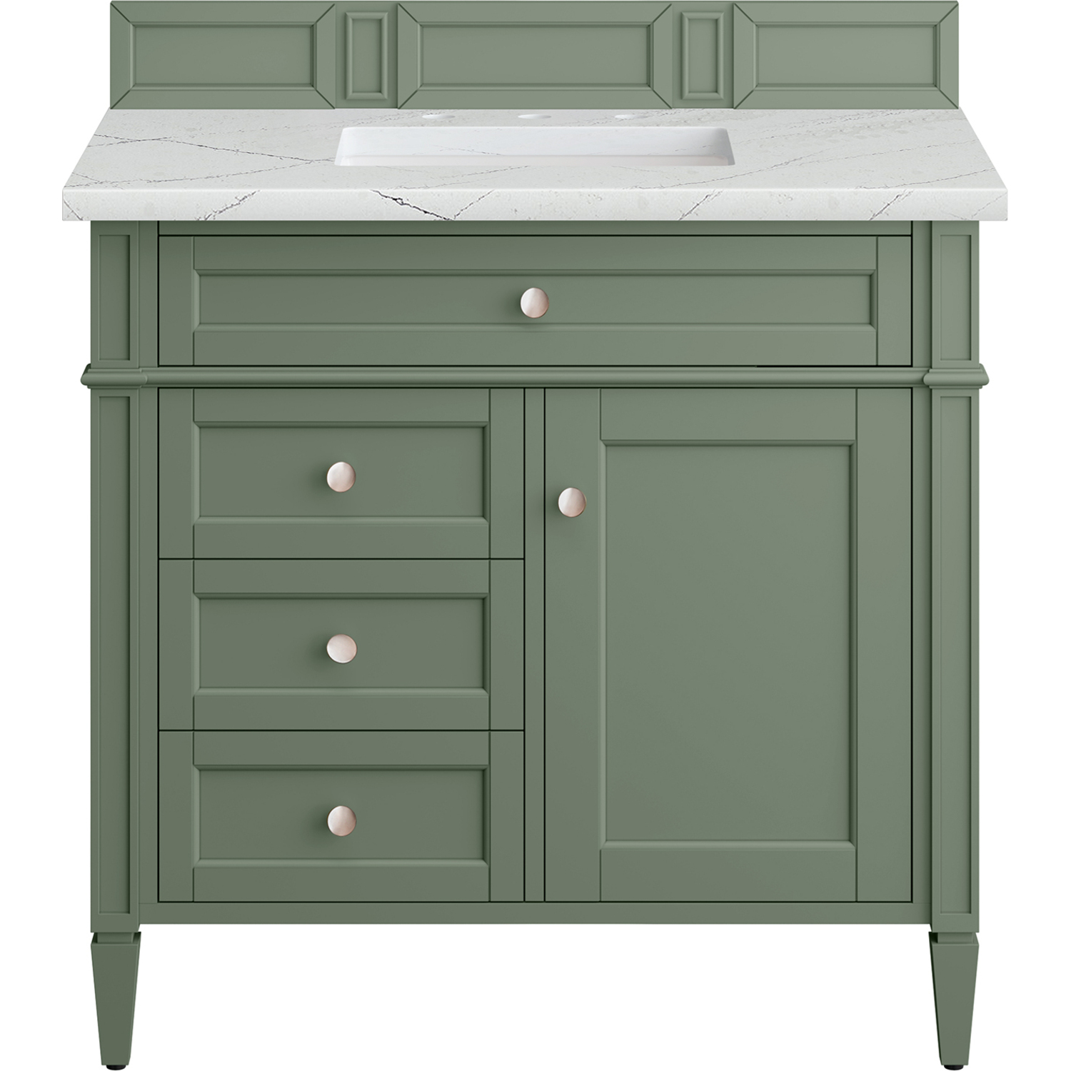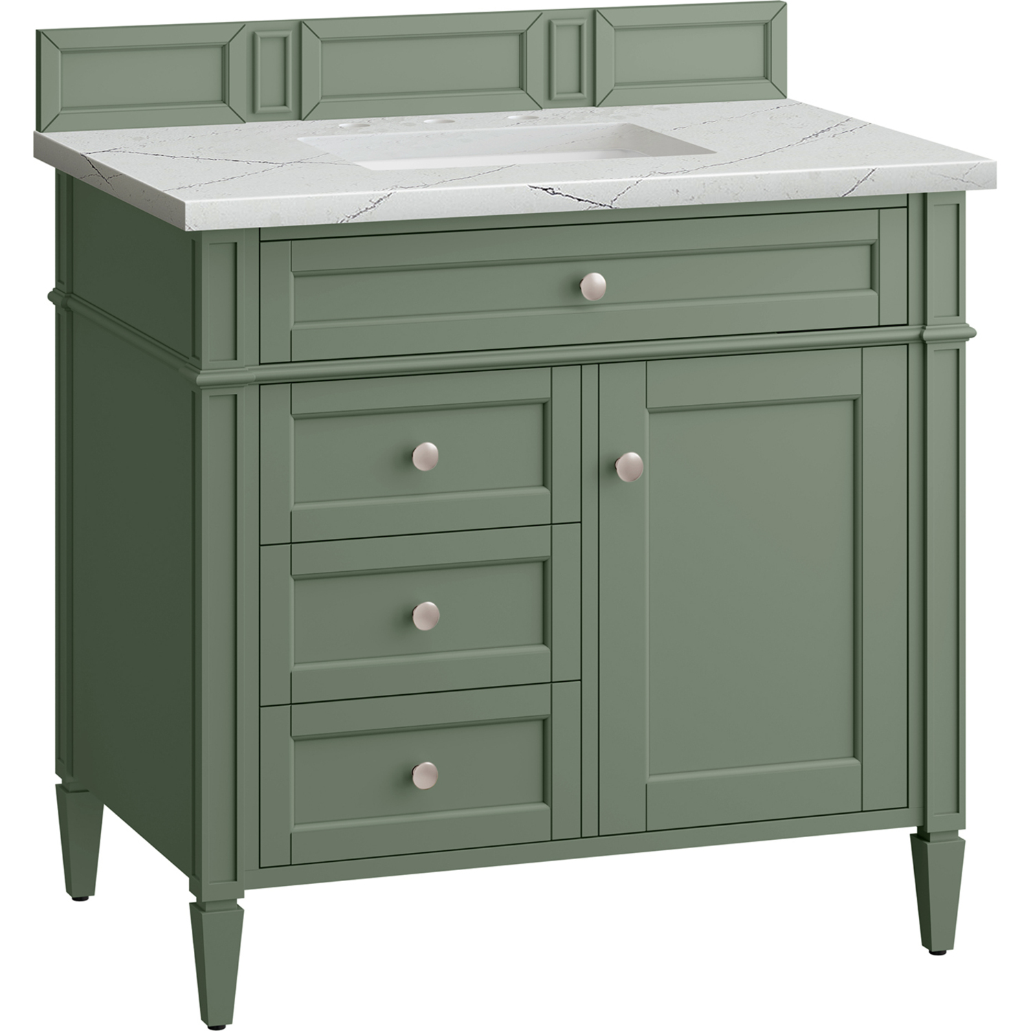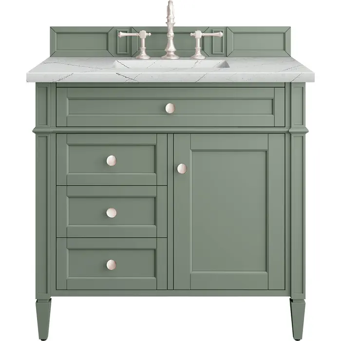 The Smokey Celadon finish on the 36" Brittany Vanity adds a refreshing, natural element to any bathroom space. This moody, yet muted green, with subtle blue and grey undertones, brings the rich, timeless details of the Brittany collection to life. The 36" cabinet, with decorative wood backsplash, features optimal organization with one hide-away tip-out drawer plus two side drawers, one of which is a double height for storing taller items while the other contains a removable bamboo organizer tray. This cabinet also has one door, which conceals an interior shelf. All drawers are lined with an aluminum laminate surface for easy cleaning and are equipped with undermount soft-close slides. The feathery, grey, and black veining on the cool white tones of the Ethereal Noctis quarts top create a modern classic look. All of our 3 CM tops include a porcelain undermount sink.One door Smokey Celadon single vanity with three drawers and interior shelf space; lower drawer is double-height; top drawer is tip-out styleHardware Finish: Satin NickelSolid kiln-dried Grade A hardwoodCabinet is finished inside and out with a premium undercoat finish for superior moisture and UV resistanceSoft-close undermount drawer glides and soft-close door hingesDrawer bottoms are lined with our signature brushed aluminum laminateMatching decorative wood backsplash is included3 CM eased edge Ethereal Noctis Silestone top and one white porcelain rectangular sinkCountertop is pre-drilled for one 3-hole 8" spreadFaucet sold separatelyOur most popular collection, the Brittany was thoughtfully crafted to combine both traditional and modern style. The tapered legs are a recognizable nod to the past, while the straight lines and shaker-style detailing suggest a more contemporary aesthetic. Available in eight beautiful finishes, Brittany's versatile design blends seamlessly with a wide range of interior styling, while the expansive storage options make this collection a functional solution for any bathroom.1 year warranty against manufacturer's defects. We will repair or replace any defective product, if the product is defective in material or workmanship at our discretion. No warranty is expressed or implied regarding damages resulting from consumer misuse.