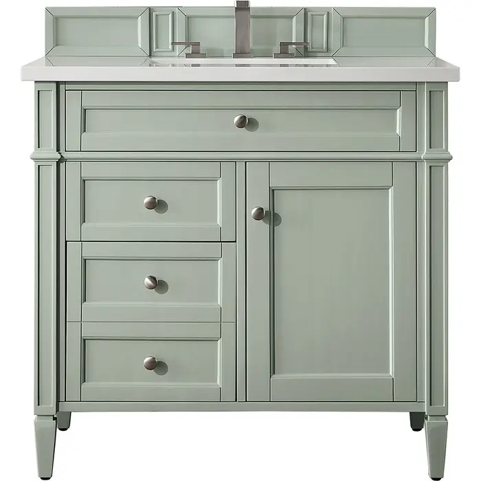 The Brittany 36" Sage Green Single Vanity by James Martin Vanities features classic details that bridge both traditional and transitional styles. This beautiful piece of furniture includes one hide-away tip-out, top row drawer plus two full-depth side drawers, one of which is double-height for storage of taller items. This cabinet also has one door, which conceals an interior shelf for ample storage. Handcrafted in yellow poplar solids and veneers with satin nickel hardware. Matching wood backsplash is included. The look is completed with a 3 CM eased edge White Zeus Silestone top by Cosentino and one white ceramic sink.One door Sage Green single vanity with three drawers and interior shelf space; lower drawer is double-height; top drawer is tip-out styleHardware Finish: Satin NickelSolid kiln-dried Grade A hardwoodCabinet is finished inside and out with a premium undercoat finish for superior moisture and UV resistanceSoft-close undermount drawer glides and soft-close door hingesDrawer bottoms are lined with our signature brushed aluminum laminateMatching decorative wood backsplash is included3 CM eased edge White Zeus Silestone top and one white porcelain rectangular sinkCountertop is pre-drilled for one 3-hole 8" spreadFaucet sold separatelyOur most popular collection, the Brittany was thoughtfully crafted to combine both traditional and modern style. The tapered legs are a recognizable nod to the past, while the straight lines and shaker-style detailing suggest a more contemporary aesthetic. Available in eight beautiful finishes, Brittany's versatile design blends seamlessly with a wide range of interior styling, while the expansive storage options make this collection a functional solution for any bathroom.1 year warranty against manufacturer's defects. We will repair or replace any defective product, if the product is defective in material or workmanship at our discretion. No warranty is expressed or implied regarding damages resulting from consumer misuse.