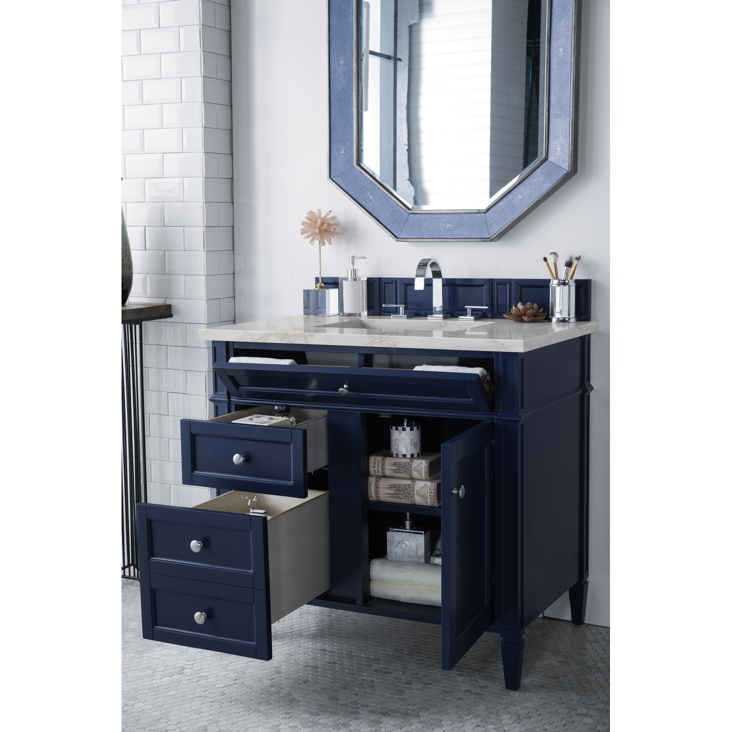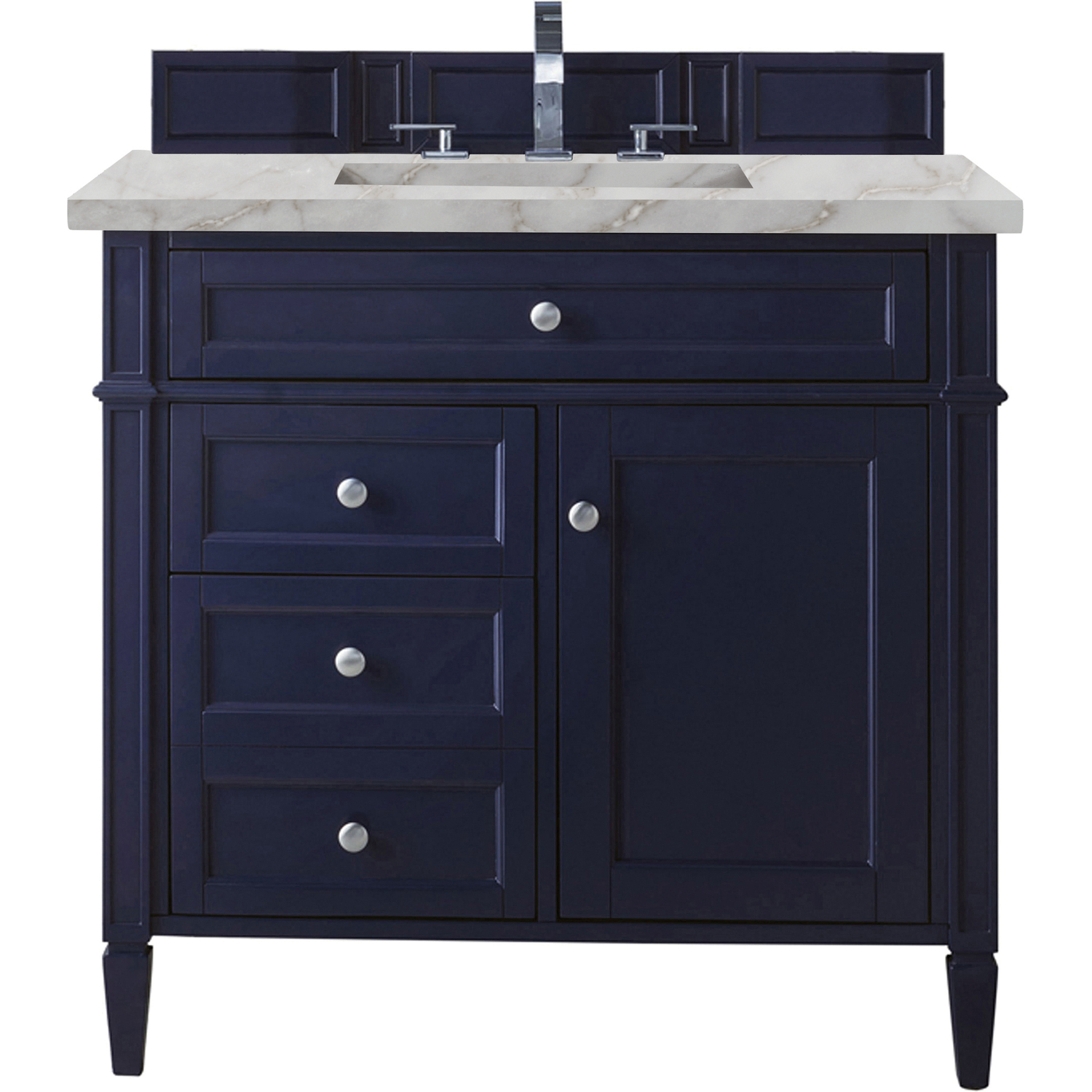 The Brittany 36" Victory Blue Single Vanity by James Martin Vanities features classic details that bridge both traditional and transitional styles. This beautiful piece of furniture includes one hide-away tip-out, top row drawer plus two full-depth side drawers, one of which is double-height for storage of taller items. This cabinet also has one door, which conceals an interior shelf for ample storage. Handcrafted in yellow Poplar solids and veneers with satin nickel hardware. Matching wood backsplash is included. The look is completed with a 3 CM eased-edge countertop by Cosentino in Victorian Silver, which features a cool background tone with silver and dark neutral veins, complimented with champagne metallic accents. It includes pre-drilled holes for an 8-inch widespread faucet (not included), one white porcelain rectangular sink, as well as the appropriate mounting brackets for installation.Vanity set includes a 3cm eased edge Victorian Silver Silestone top, a white porcelain rectangular sink and mounting brackets for easy installation. Top is pre-drilled for an 8" widespread faucet. Faucet not included.One door Victory Blue single vanity with three drawers and interior shelf space; lower drawer is double-height; top drawer is tip-out styleCrafted from Poplar solids and plywood and is sealed inside and outside with our premium moisture and UV resistant coatingDrawer boxes are constructed using English Dovetail joinery, feature soft-close undermount glides and a Brushed Aluminum laminate drawer bottom.Satin Nickel HardwareIncludes one removable Bamboo drawer organizer trayMatching decorative wood backsplash is includedFaucet sold separatelyCountertop is pre-drilled for one 3-hole 8" spreadOur most popular collection, the Brittany was thoughtfully crafted to combine both traditional and modern style. The tapered legs are a recognizable nod to the past, while the straight lines and shaker-style detailing suggest a more contemporary aesthetic. Available in eight beautiful finishes, Brittany's versatile design blends seamlessly with a wide range of interior styling, while the expansive storage options make this collection a functional solution for any bathroom.1 year warranty against manufacturer's defects. We will repair or replace any defective product, if the product is defective in material or workmanship at our discretion. No warranty is expressed or implied regarding damages resulting from consumer misuse.