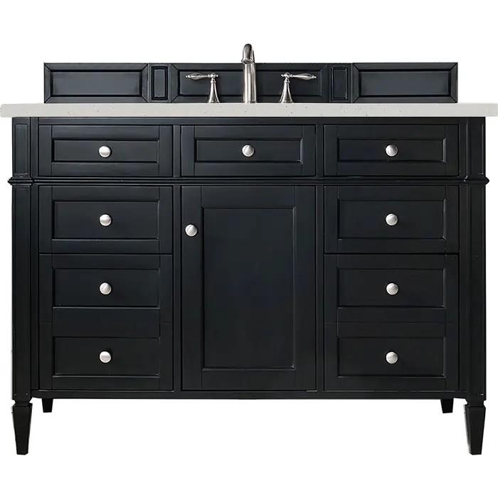 The Brittany 48" Black Onyx Single Vanity by James Martin Vanities features classic details that bridge both traditional and transitional styles. This beautiful piece of furniture includes one hide-away top row tip-out drawer, plus six full-depth drawers, two of which are double-height for storage of taller items. This cabinet also has one door, which conceals an interior shelf for ample storage. Handcrafted in yellow Poplar solids and veneers with satin nickel hardware. Matching wood backsplash is included. The look is completed with a 3 CM eased-edge countertop by Cosentino in Lime Delight, which brings a warm, textured beige tones in a suede finish. It includes pre-drilled holes for an 8-inch widespread faucet (not included), one white porcelain rectangular sink, as well as the appropriate mounting brackets for installation.Vanity set includes a 3cm eased edge Limestone Delight Silestone top. Includes a white porcelain rectangular undermount sink that ships separately and mounting brackets for easy installation. Top is pre-drilled for 8" widespread faucet. Faucet not includeSingle door cabinet with one adjustable interior shelf, one top-row tip-out drawer, and six standard full-extension drawersCrafted from Poplar solids and plywood and is sealed inside and outside with our premium moisture and UV resistant coatingDrawer boxes are constructed using English Dovetail joinery, feature soft-close undermount glides and a Brushed Aluminum laminate drawer bottom.Satin Nickel HardwareIncludes one removable Bamboo drawer organizer trayMatching decorative wood backsplash is includedFaucet sold separatelyCountertop is pre-drilled for one 3-hole 8" spreadOur most popular collection, the Brittany was thoughtfully crafted to combine both traditional and modern style. The tapered legs are a recognizable nod to the past, while the straight lines and shaker-style detailing suggest a more contemporary aesthetic. Available in eight beautiful finishes, Brittany's versatile design blends seamlessly with a wide range of interior styling, while the expansive storage options make this collection a functional solution for any bathroom.1 year warranty against manufacturer's defects. We will repair or replace any defective product, if the product is defective in material or workmanship at our discretion. No warranty is expressed or implied regarding damages resulting from consumer misuse.