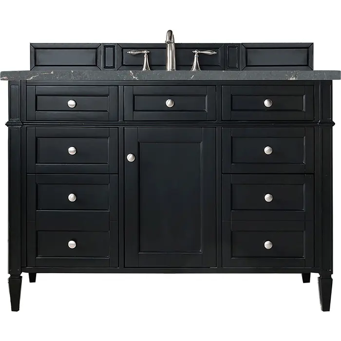 The Brittany 48" Single Vanity by James Martin Vanities features a rich Black Onyx finish and classic details that bridge both traditional and transitional styles. Featuring tapered legs and shaker-style detailing, this vanity includes one cabinet door that opens to reveal an interior shelf. Four standard full-extension drawers, two double-height drawers for storage of taller items, and one top-row tip-out drawer lend additional storage. Brittany showcases Satin Nickel hardware and comes with an optional coordinating wood backsplash. A gorgeous Parisien Bleu Silestone® top with undermount sink completes the look. This unit is enabled with FreePower wireless charging; featuring a single-device charger seamlessly embedded into the countertop, indicated by a light-up halo to the left of the sink. Designed for modern living, FreePower offers convenient, integrated, wireless charging when and where you need it.FreePower Wireless Charging; single-device unit left of sinkOne door cabinet with six full-extension drawers (two double-deep), and one top-row tip-out drawerDrawer boxes feature English Dovetail joinery with premium, soft-close undermount drawer slides and doors feature soft-close, adjustable door hingesCabinet features a multi-stage premium finish coat to offer UV and moisture resistanceBlack Onyx finish with Satin Nickel hardwareCountertop is pre-drilled for 8" widespread faucet(s); our 3cm eased edge countertops come with white porcelain rectangular sink(s) that ship separately and include mounting brackets for easy installationFaucet(s) sold separatelyDrawers lined with our signature brushed aluminum laminate for easy cleaningTop-row tip-out drawer with removable bamboo linerComes with optional, coordinating wood backsplash; matching stone backsplash available as add-on purchaseFreestanding VanityThe Brittany Collection by James Martin Vanities was thoughtfully crafted to combine both traditional and modern styles. The tapered legs are a recognizable nod to the past, while the straight lines and shaker-style detailing suggest a more contemporary aesthetic. Available in eight beautiful finishes, Brittany's versatile design blends seamlessly with a wide range of interior styling, while the expansive storage options make this collection a functional solution for any bathroom.1 year warranty against manufacturer's defects. We will repair or replace any defective product, if the product is defective in material or workmanship at our discretion. No warranty is expressed or implied regarding damages resulting from consumer misuse.
