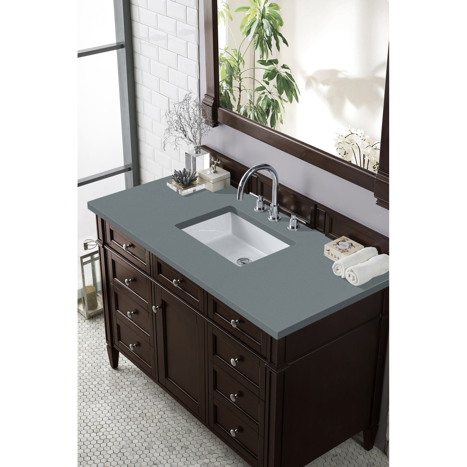 - Subtle luxury. James Martin Vanities most popular collection, Brittany, was designed to merge traditional and transitional tastes. The tapered legs are a nod to the past, but the restrained use of ornamentation suggests a modern aesthetic. Interior space and storage are ample, including our top row “tip out” drawers which utilize the space in front of the sink. Cabinets are crafted from kiln-dried North American Birch and White Poplar hardwoods. Seven widths of cabinet are offered in the Brittany series and are available in six finish options: Burnished Mahogany, Bright White, Urban Gray, Black Onyx, Saddle Brown and Sage Green. Three widths of coordinating mirrors will add finishing touches to your room.