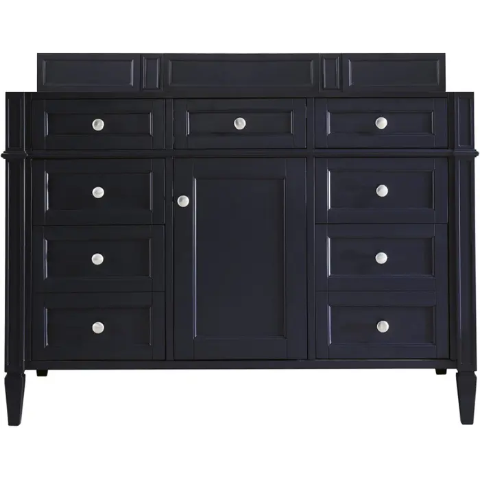 The Brittany 48" Victory Blue Single Vanity by James Martin Vanities features classic details that bridge both traditional and transitional styles. This beautiful piece of furniture includes one hide-away top row tip-out drawer, plus six full-depth drawers, two of which are double-height for storage of taller items. This cabinet also has one door, which conceals an interior shelf, for ample storage. Handcrafted in yellow poplar solids and veneers with satin nickel hardware. Matching wood backsplash is included.Single door cabinet with one adjustable interior shelf, one top-row tip-out drawer, and six standard full-extension drawersHardware Finish: Satin NickelSolid kiln-dried Grade A hardwoodCabinet is finished inside and out with a premium undercoat finish for superior moisture and UV resistanceSoft-close undermount drawer glides and soft-close door hingesDrawer bottoms are lined with our signature brushed aluminum laminateMatching decorative wood backsplash is includedCabinet only, countertop and sink not includedOur most popular collection, the Brittany was thoughtfully crafted to combine both traditional and modern style. The tapered legs are a recognizable nod to the past, while the straight lines and shaker-style detailing suggest a more contemporary aesthetic. Available in eight beautiful finishes, Brittany's versatile design blends seamlessly with a wide range of interior styling, while the expansive storage options make this collection a functional solution for any bathroom.1 year warranty against manufacturer's defects. We will repair or replace any defective product, if the product is defective in material or workmanship at our discretion. No warranty is expressed or implied regarding damages resulting from consumer misuse.