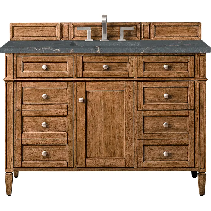 The Brittany 48" Single Vanity by James Martin Vanities features a warm Saddle Brown finish and classic details that bridge both traditional and transitional styles. Featuring tapered legs and shaker-style detailing, this vanity includes one cabinet door that opens to reveal an interior shelf. Four standard full-extension drawers, two double-height drawers for storage of taller items, and one top-row tip-out drawer lend additional storage. Brittany showcases Satin Nickel hardware and comes with an optional coordinating wood backsplash. A gorgeous Parisien Bleu Silestone® top with undermount sink completes the look. This unit is enabled with FreePower wireless charging; featuring a single-device charger seamlessly embedded into the countertop, indicated by a light-up halo to the left of the sink. Designed for modern living, FreePower offers convenient, integrated, wireless charging when and where you need it.FreePower Wireless Charging; single-device unit left of sinkOne door cabinet with six full-extension drawers (two double-deep), and one top-row tip-out drawerDrawer boxes feature English Dovetail joinery with premium, soft-close undermount drawer slides and doors feature soft-close, adjustable door hingesCabinet features a multi-stage premium finish coat to offer UV and moisture resistanceSaddle Brown finish with Satin Nickel hardwareCountertop is pre-drilled for 8" widespread faucet(s); our 3cm eased edge countertops come with white porcelain rectangular sink(s) that ship separately and include mounting brackets for easy installationFaucet(s) sold separatelyDrawers lined with our signature brushed aluminum laminate for easy cleaningTop-row tip-out drawer with removable bamboo linerComes with optional, coordinating wood backsplash; matching stone backsplash available as add-on purchaseFreestanding VanityThe Brittany Collection by James Martin Vanities was thoughtfully crafted to combine both traditional and modern styles. The tapered legs are a recognizable nod to the past, while the straight lines and shaker-style detailing suggest a more contemporary aesthetic. Available in eight beautiful finishes, Brittany's versatile design blends seamlessly with a wide range of interior styling, while the expansive storage options make this collection a functional solution for any bathroom.1 year warranty against manufacturer's defects. We will repair or replace any defective product, if the product is defective in material or workmanship at our discretion. No warranty is expressed or implied regarding damages resulting from consumer misuse.