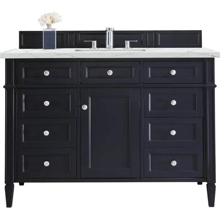 The Brittany 48" Victory Blue Single Vanity by James Martin Vanities features classic details that bridge both traditional and transitional styles. This beautiful piece of furniture includes one hide-away top row tip-out drawer, plus six full-depth drawers, two of which are double-height for storage of taller items. This cabinet also has one door, which conceals an interior shelf for ample storage. Handcrafted in yellow poplar solids and veneers with satin nickel hardware. Matching wood backsplash is included. The look is completed with a 3 CM eased edge Ethereal Noctis Silestone top by Cosentino and one white ceramic sink.Single door cabinet with one adjustable interior shelf, one top-row tip-out drawer, and six standard full-extension drawersHardware Finish: Satin NickelSolid kiln-dried Grade A hardwoodCabinet is finished inside and out with a premium undercoat finish for superior moisture and UV resistanceSoft-close undermount drawer glides and soft-close door hingesDrawer bottoms are lined with our signature brushed aluminum laminateMatching decorative wood backsplash is included3 CM eased edge Ethereal Noctis Silestone top and one white porcelain rectangular sinkCountertop is pre-drilled for one 3-hole 8" spreadFaucet sold separatelyOur most popular collection, the Brittany was thoughtfully crafted to combine both traditional and modern style. The tapered legs are a recognizable nod to the past, while the straight lines and shaker-style detailing suggest a more contemporary aesthetic. Available in eight beautiful finishes, Brittany's versatile design blends seamlessly with a wide range of interior styling, while the expansive storage options make this collection a functional solution for any bathroom.1 year warranty against manufacturer's defects. We will repair or replace any defective product, if the product is defective in material or workmanship at our discretion. No warranty is expressed or implied regarding damages resulting from consumer misuse.