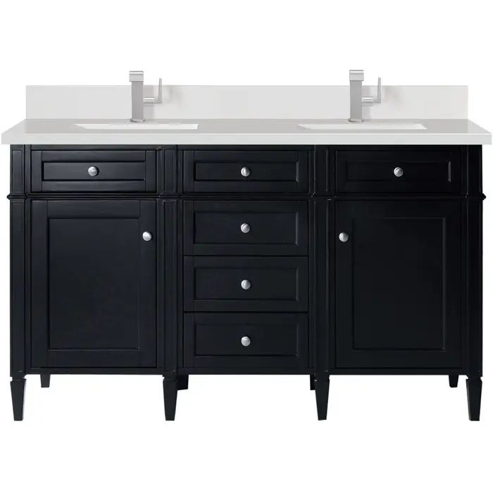 The Brittany 60" Black Onyx Double Vanity by James Martin Vanities features classic details that bridge both traditional and transitional styles. This beautiful piece of furniture includes one hide-away top row tip-out drawer, plus six full-depth drawers, two of which are double-height for storage of taller items. This cabinet also has one door, which conceals an interior shelf for ample storage. Handcrafted in yellow Poplar solids and veneers with satin nickel hardware. Matching wood backsplash is included. The look is completed with a 3 CM eased-edge countertop by Cosentino in White Zeus, which gives a crisp and clean finish to your vanity. It includes one pre-drilled hole for a single-hole faucet (not included), one matching stone backsplash, two white porcelain rectangular sinks, as well as the appropriate mounting brackets for installation.Vanity set includes a 3cm eased edge White Zeus Silestone top with matching backsplash, two white porcelain rectangular sinks and mounting brackets for easy installation. Top is pre-drilled for two single hole faucets. Faucets not included.Two door Black Onyx double vanity with six drawers and interior shelf space; top outside drawers are tip-out styleCrafted from Poplar solids and plywood and is sealed inside and outside with our premium moisture and UV resistant coatingDrawer boxes are constructed using English Dovetail joinery, feature soft-close undermount glides and a Brushed Aluminum laminate drawer bottom.Satin Nickel HardwareIncludes one removable Bamboo drawer organizer trayMatching White Zeus 3cm Silestone backsplash & decorative wood backsplash included.Faucets sold separatelyOur most popular collection, the Brittany was thoughtfully crafted to combine both traditional and modern style. The tapered legs are a recognizable nod to the past, while the straight lines and shaker-style detailing suggest a more contemporary aesthetic. Available in eight beautiful finishes, Brittany's versatile design blends seamlessly with a wide range of interior styling, while the expansive storage options make this collection a functional solution for any bathroom.1 year warranty against manufacturer's defects. We will repair or replace any defective product, if the product is defective in material or workmanship at our discretion. No warranty is expressed or implied regarding damages resulting from consumer misuse.