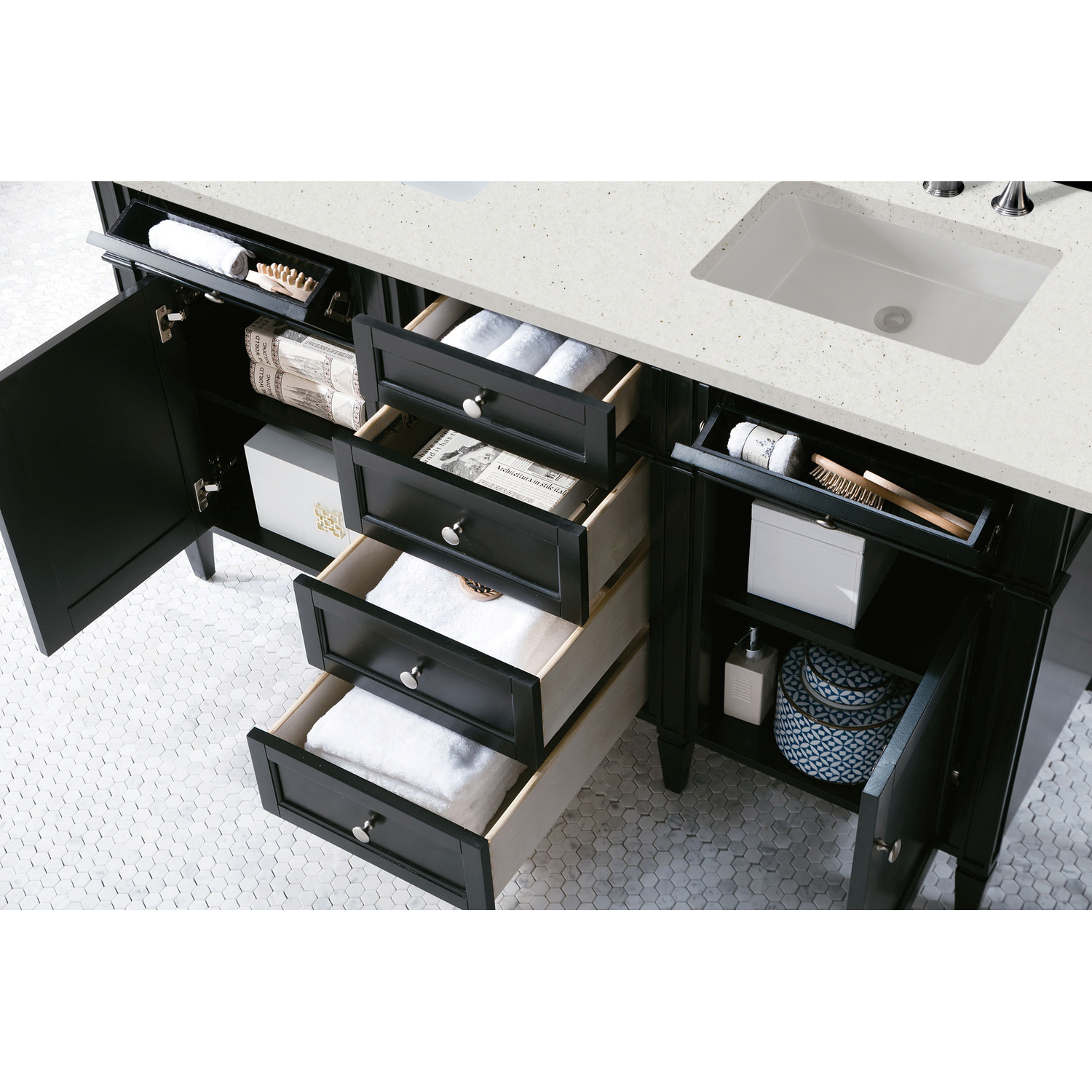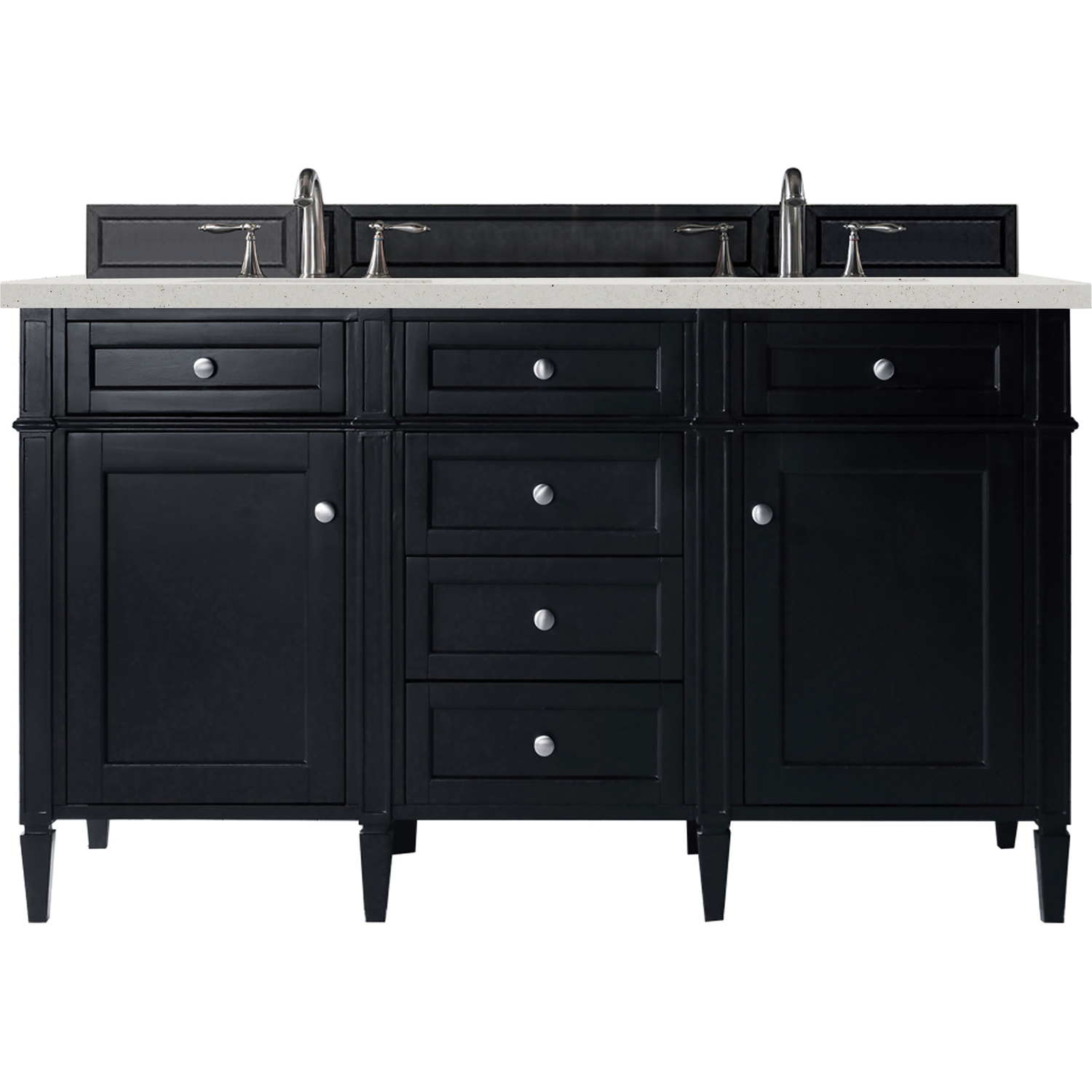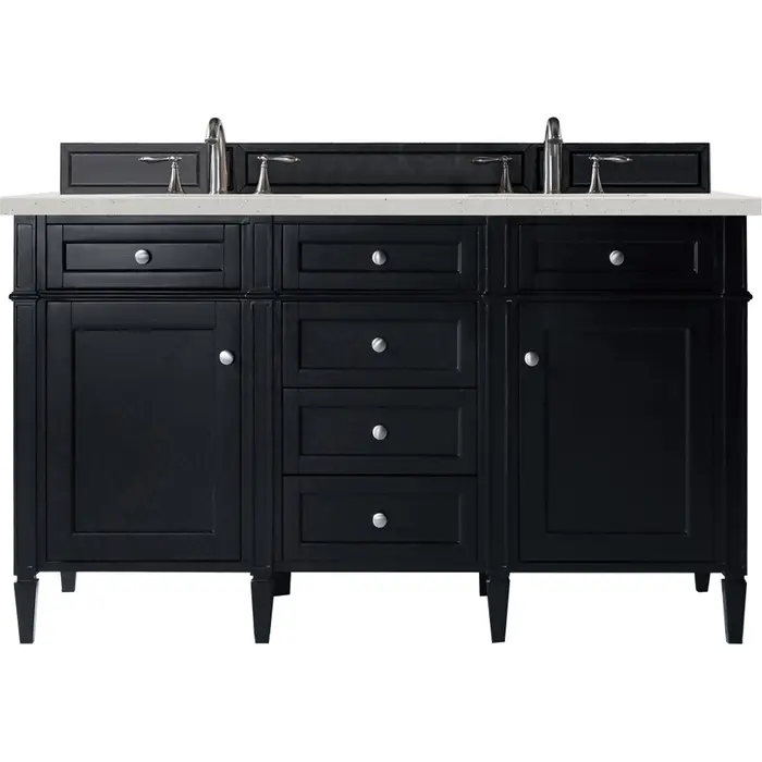 The Brittany 60" Black Onyx Single Vanity by James Martin Vanities features classic details that bridge both traditional and transitional styles. This beautiful piece of furniture includes one hide-away top row tip-out drawer, plus six full-depth drawers, two of which are double-height for storage of taller items. This cabinet also has one door, which conceals an interior shelf for ample storage. Handcrafted in yellow Poplar solids and veneers with satin nickel hardware. Matching wood backsplash is included. The look is completed with a 3 CM eased-edge countertop by Cosentino in Lime Delight, which brings a warm, textured beige tones in a suede finish. It includes pre-drilled holes for two 8-inch widespread faucets (not included), two white porcelain rectangular sinks, as well as the appropriate mounting brackets for installation.Vanity set includes a 3cm eased edge Limestone Delight Silestone top. Includes two white porcelain rectangular undermount sinks that ship separately and mounting brackets for easy installation. Top is pre-drilled for two 8" widespread faucets. Faucets notTwo door Black Onyx double vanity with six drawers and interior shelf space; top outside drawers are tip-out styleCrafted from Poplar solids and plywood and is sealed inside and outside with our premium moisture and UV resistant coatingDrawer boxes are constructed using English Dovetail joinery, feature soft-close undermount glides and a Brushed Aluminum laminate drawer bottom.Satin Nickel HardwareIncludes one removable Bamboo drawer organizer trayMatching decorative wood backsplash is includedFaucets sold separatelyCountertop is pre-drilled for two 3-hole 8" spreadsOur most popular collection, the Brittany was thoughtfully crafted to combine both traditional and modern style. The tapered legs are a recognizable nod to the past, while the straight lines and shaker-style detailing suggest a more contemporary aesthetic. Available in eight beautiful finishes, Brittany's versatile design blends seamlessly with a wide range of interior styling, while the expansive storage options make this collection a functional solution for any bathroom.1 year warranty against manufacturer's defects. We will repair or replace any defective product, if the product is defective in material or workmanship at our discretion. No warranty is expressed or implied regarding damages resulting from consumer misuse.