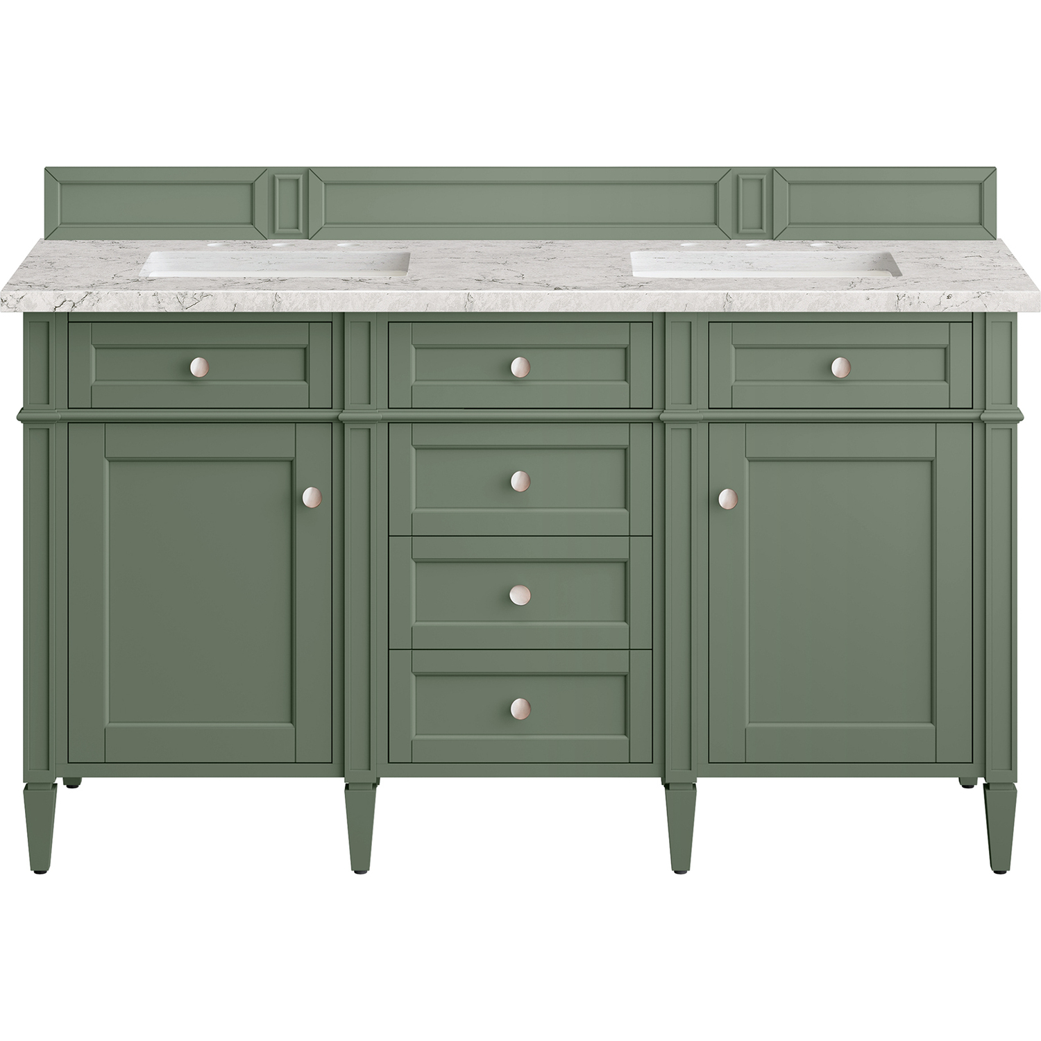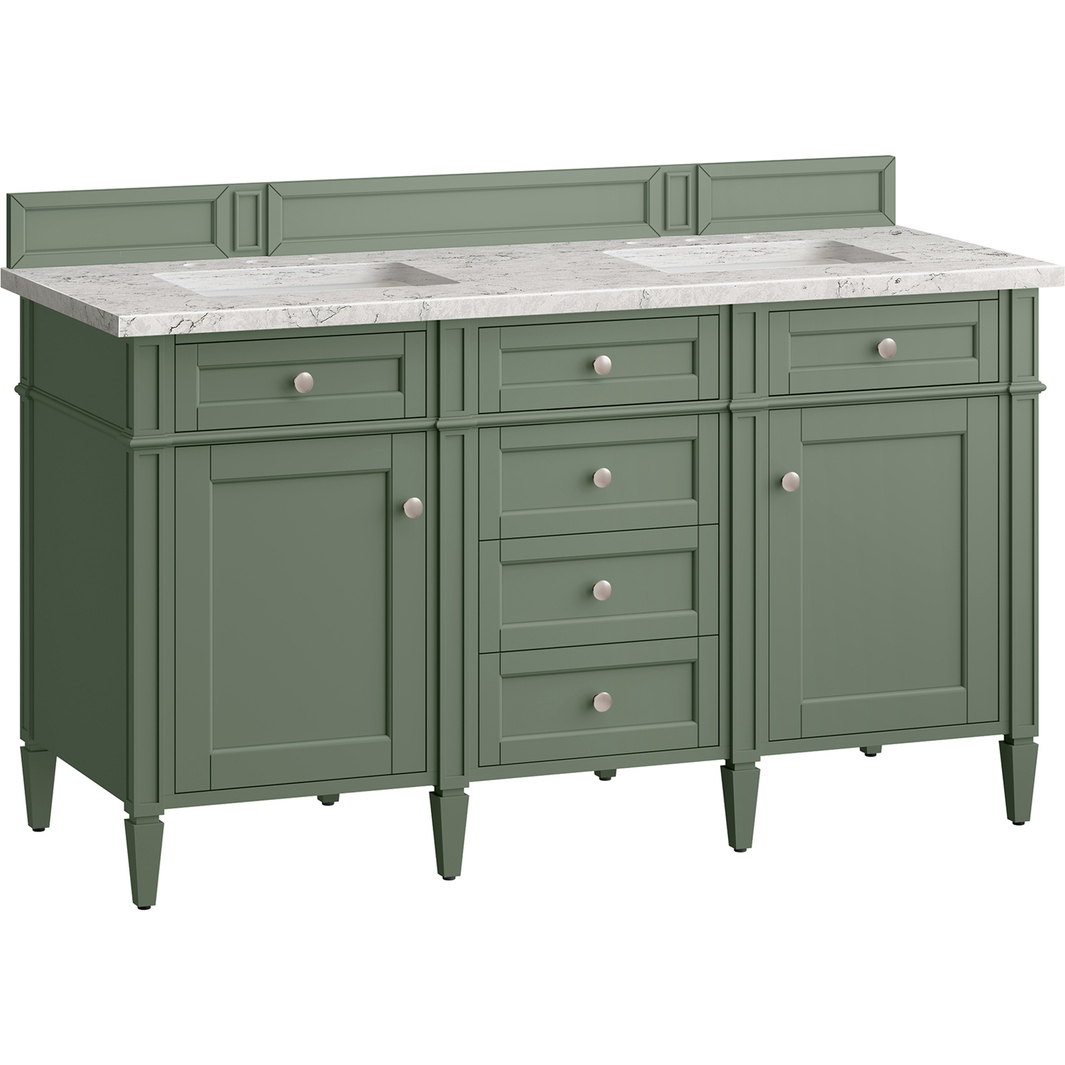 The Smokey Celadon finish on the 60" Brittany Double Vanity Brittany Vanity adds a refreshing, natural element to any bathroom space. This moody, yet muted green, with subtle blue and grey undertones, brings the rich, timeless details of the Brittany collection to life. The 60" Brittany Double Vanity Cabinet, with decorative wood backsplash, features optimal organization with two hide-away tip-out drawers plus four center drawers. This cabinet also has two doors, each concealing an interior shelf. All drawers are lined with an aluminum laminate surface for easy cleaning and are equipped with undermount soft-close slides. The marbleized detail and neutral contrasting hues of the Eternal Jasmine Pearl Silestone top allow for a rich, elegant look. All of our 3 CM tops include a porcelain undermount sink.Two door Smokey Celadon double vanity with six drawers and interior shelf space; top outside drawers are tip-out styleHardware Finish: Satin NickelSolid kiln-dried Grade A hardwoodCabinet is finished inside and out with a premium undercoat finish for superior moisture and UV resistanceSoft-close undermount drawer glides and soft-close door hingesDrawer bottoms are lined with our signature brushed aluminum laminateMatching decorative wood backsplash is included3 CM eased edge Eternal Jasmine Pearl Silestone top and two white porcelain rectangular sinksCountertop is pre-drilled for two 3-hole 8" spreadsFaucets sold separatelyOur most popular collection, the Brittany was thoughtfully crafted to combine both traditional and modern style. The tapered legs are a recognizable nod to the past, while the straight lines and shaker-style detailing suggest a more contemporary aesthetic. Available in eight beautiful finishes, Brittany's versatile design blends seamlessly with a wide range of interior styling, while the expansive storage options make this collection a functional solution for any bathroom.1 year warranty against manufacturer's defects. We will repair or replace any defective product, if the product is defective in material or workmanship at our discretion. No warranty is expressed or implied regarding damages resulting from consumer misuse.