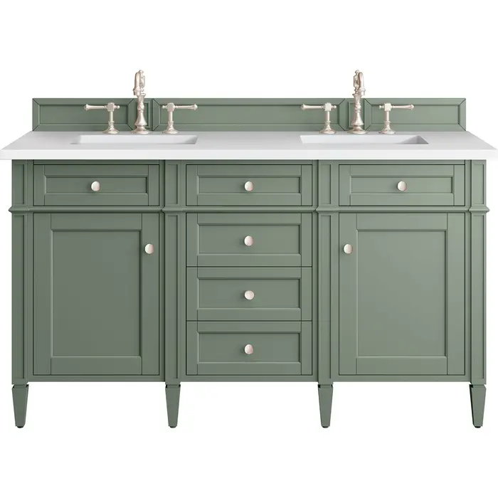 The Smokey Celadon finish on the 60" Brittany Double Vanity Brittany Vanity adds a refreshing, natural element to any bathroom space. This moody, yet muted green, with subtle blue and grey undertones, brings the rich, timeless details of the Brittany collection to life. The 60" Brittany Double Vanity Cabinet, with decorative wood backsplash, features optimal organization with two hide-away tip-out drawers plus four center drawers. This cabinet also has two doors, each concealing an interior shelf. All drawers are lined with an aluminum laminate surface for easy cleaning and are equipped with undermount soft-close slides. The bright, crisp White Zeus 3 CM Silestone top adds a beautiful finishing touch. All of our 3 CM tops include a porcelain undermount sink.Two door Smokey Celadon double vanity with six drawers and interior shelf space; top outside drawers are tip-out styleHardware Finish: Satin NickelSolid kiln-dried Grade A hardwoodCabinet is finished inside and out with a premium undercoat finish for superior moisture and UV resistanceSoft-close undermount drawer glides and soft-close door hingesDrawer bottoms are lined with our signature brushed aluminum laminateMatching decorative wood backsplash is included3 CM eased edge White Zeus Silestone top and two white porcelain rectangular sinksCountertop is pre-drilled for two 3-hole 8" spreadsFaucets sold separatelyOur most popular collection, the Brittany was thoughtfully crafted to combine both traditional and modern style. The tapered legs are a recognizable nod to the past, while the straight lines and shaker-style detailing suggest a more contemporary aesthetic. Available in eight beautiful finishes, Brittany's versatile design blends seamlessly with a wide range of interior styling, while the expansive storage options make this collection a functional solution for any bathroom.1 year warranty against manufacturer's defects. We will repair or replace any defective product, if the product is defective in material or workmanship at our discretion. No warranty is expressed or implied regarding damages resulting from consumer misuse.