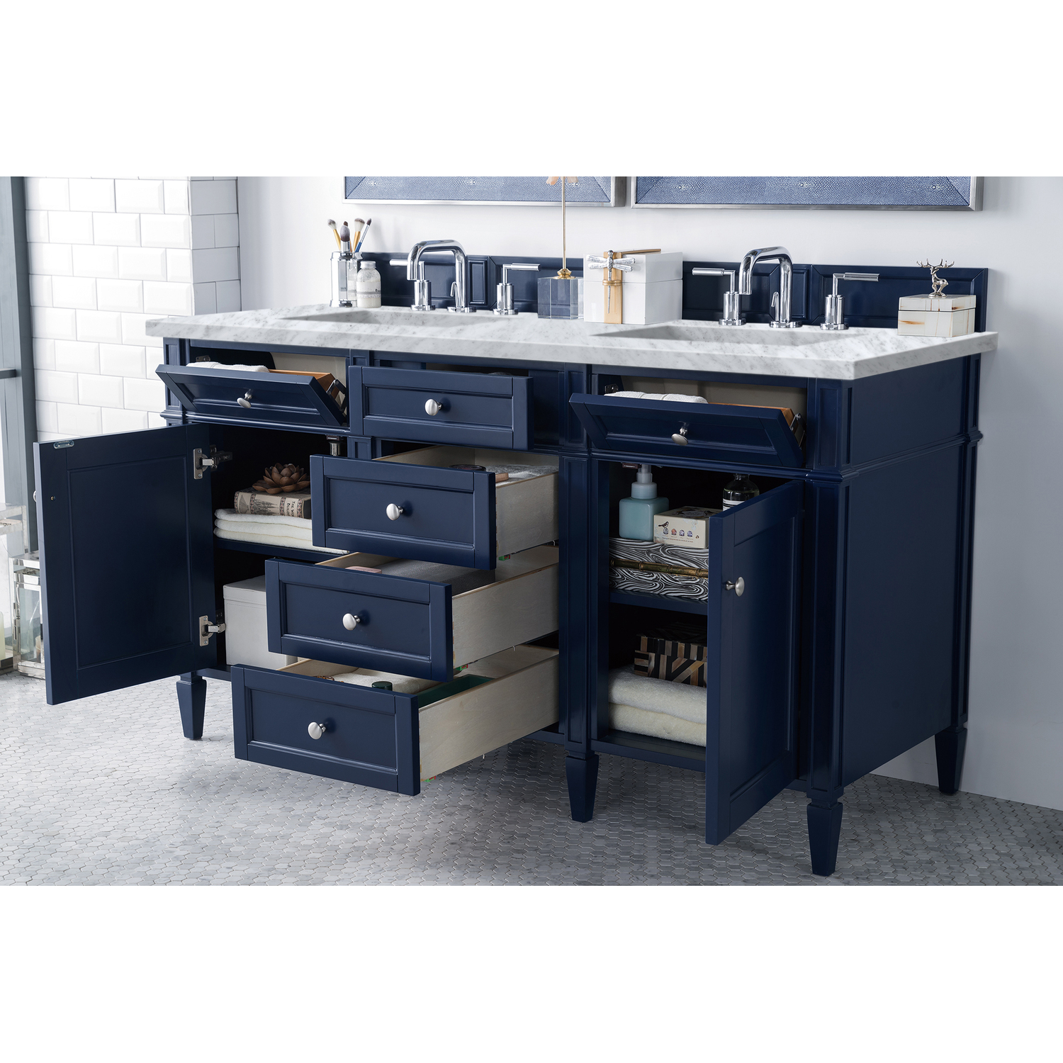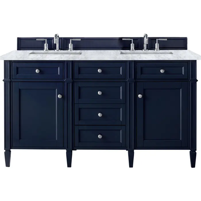 The Brittany 60" Victory Blue Double Vanity by James Martin Vanities features classic details that bridge both traditional and transitional styles. This beautiful piece of furniture includes two hide-away tip-out, top row drawers and four full-depth drawers. This cabinet also has two doors, which conceal an interior shelf for ample storage. Handcrafted in yellow poplar solids and veneers with satin nickel hardware. Matching wood backsplash is included. The look is completed with a 3 CM eased edge 3 CM eased edge Carrara Marble top with two white ceramic rectangular sinks.Two door Victory Blue double vanity with six drawers and interior shelf space; top outside drawers are tip-out styleHardware Finish: Satin NickelSolid kiln-dried Grade A hardwoodCabinet is finished inside and out with a premium undercoat finish for superior moisture and UV resistanceSoft-close undermount drawer glides and soft-close door hingesDrawer bottoms are lined with our signature brushed aluminum laminateMatching decorative wood backsplash is included3 CM eased edge Carrara Marble top and two white porcelain rectangular sinksCountertop is pre-drilled for two 3-hole 8" spreadsFaucets sold separatelyOur most popular collection, the Brittany was thoughtfully crafted to combine both traditional and modern style. The tapered legs are a recognizable nod to the past, while the straight lines and shaker-style detailing suggest a more contemporary aesthetic. Available in eight beautiful finishes, Brittany's versatile design blends seamlessly with a wide range of interior styling, while the expansive storage options make this collection a functional solution for any bathroom.1 year warranty against manufacturer's defects. We will repair or replace any defective product, if the product is defective in material or workmanship at our discretion. No warranty is expressed or implied regarding damages resulting from consumer misuse.