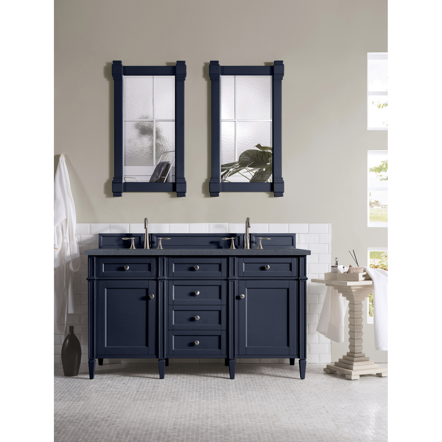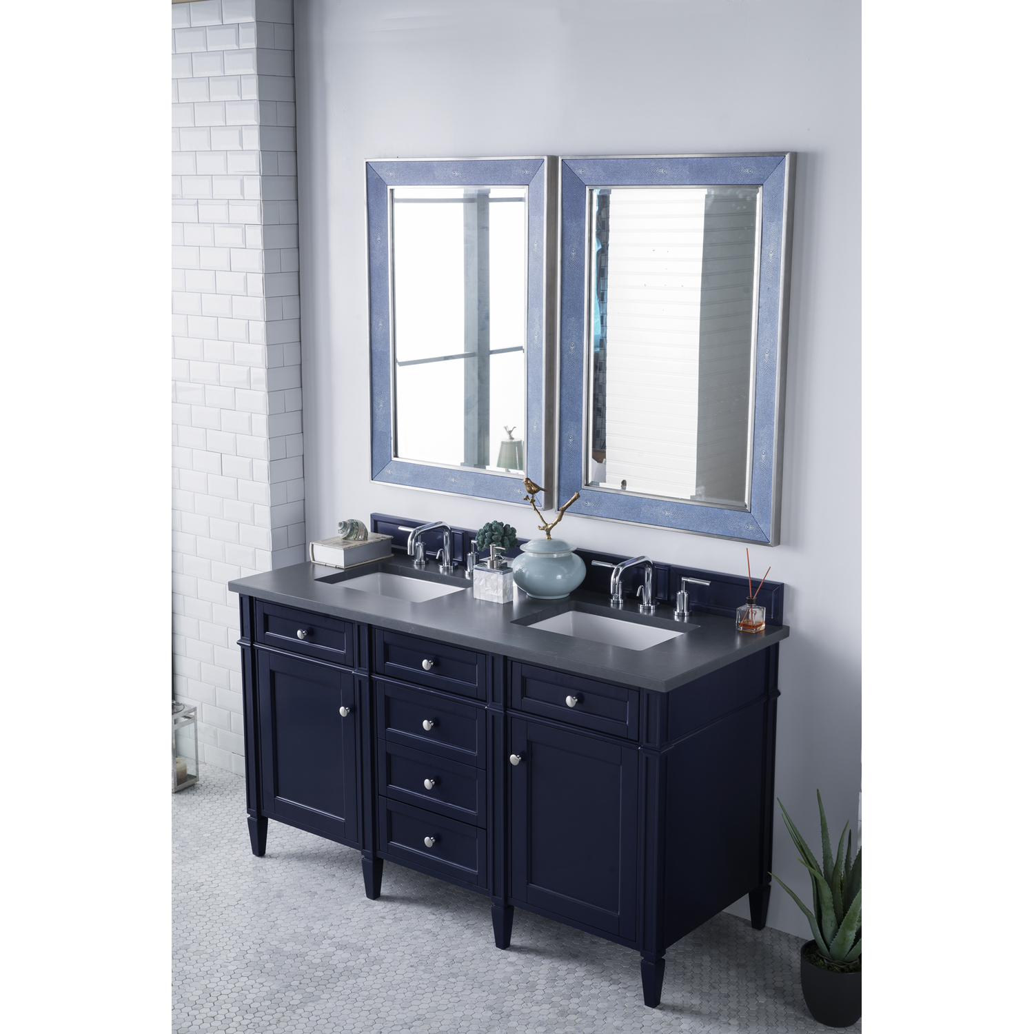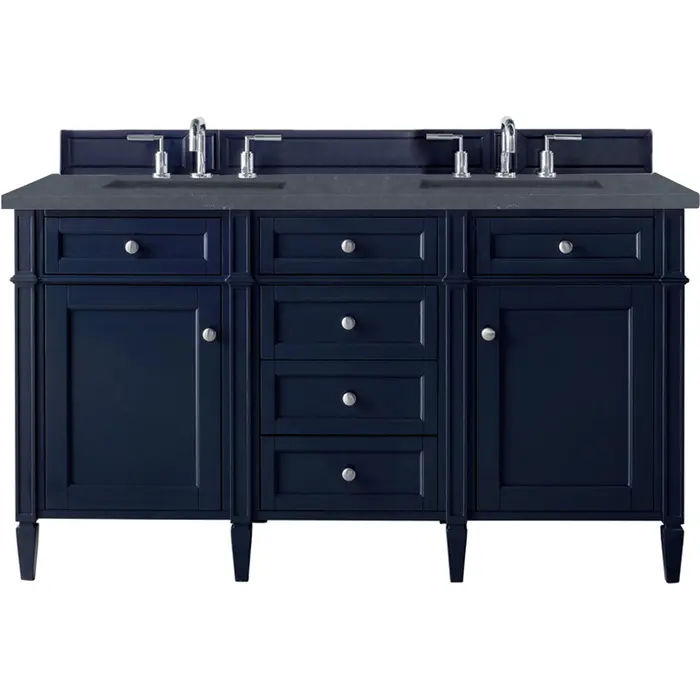 The Brittany 60" Victory Blue Double Vanity by James Martin Vanities features classic details that bridge both traditional and transitional styles. This beautiful piece of furniture includes two hide-away tip-out, top row drawers and four full-depth drawers. This cabinet also has two doors, which conceal an interior shelf for ample storage. Handcrafted in yellow poplar solids and veneers with satin nickel hardware. Matching wood backsplash is included. The look is completed with a 3 CM eased edge 3 CM eased edge Charcoal Soapstone Silestone top with two white ceramic rectangular sinks.Two door Victory Blue double vanity with six drawers and interior shelf space; top outside drawers are tip-out styleHardware Finish: Satin NickelSolid kiln-dried Grade A hardwoodCabinet is finished inside and out with a premium undercoat finish for superior moisture and UV resistanceSoft-close undermount drawer glides and soft-close door hingesDrawer bottoms are lined with our signature brushed aluminum laminateMatching decorative wood backsplash is included3 CM eased edge Charcoal Soapstone Silestone top and two white porcelain rectangular sinksCountertop is pre-drilled for two 3-hole 8" spreadsFaucets sold separatelyOur most popular collection, the Brittany was thoughtfully crafted to combine both traditional and modern style. The tapered legs are a recognizable nod to the past, while the straight lines and shaker-style detailing suggest a more contemporary aesthetic. Available in eight beautiful finishes, Brittany's versatile design blends seamlessly with a wide range of interior styling, while the expansive storage options make this collection a functional solution for any bathroom.1 year warranty against manufacturer's defects. We will repair or replace any defective product, if the product is defective in material or workmanship at our discretion. No warranty is expressed or implied regarding damages resulting from consumer misuse.