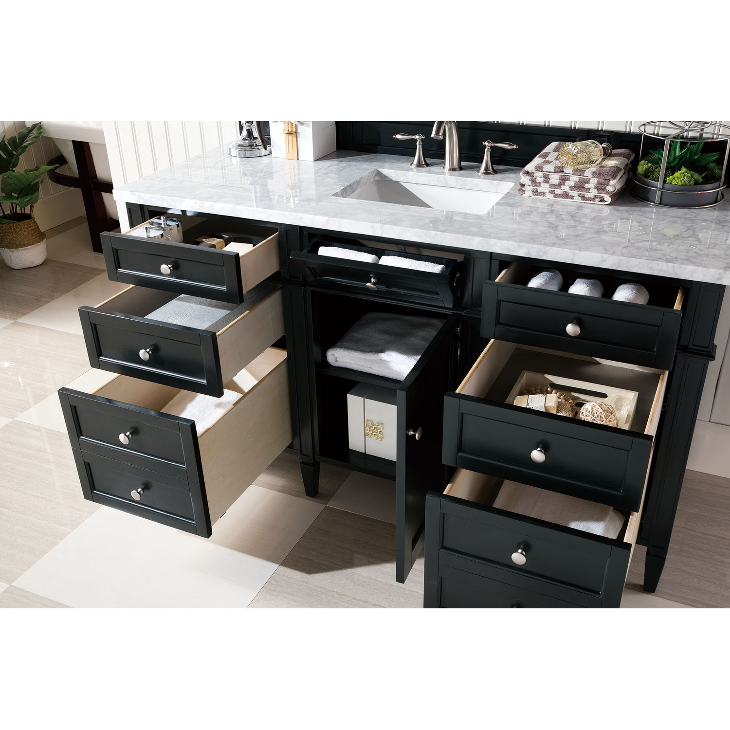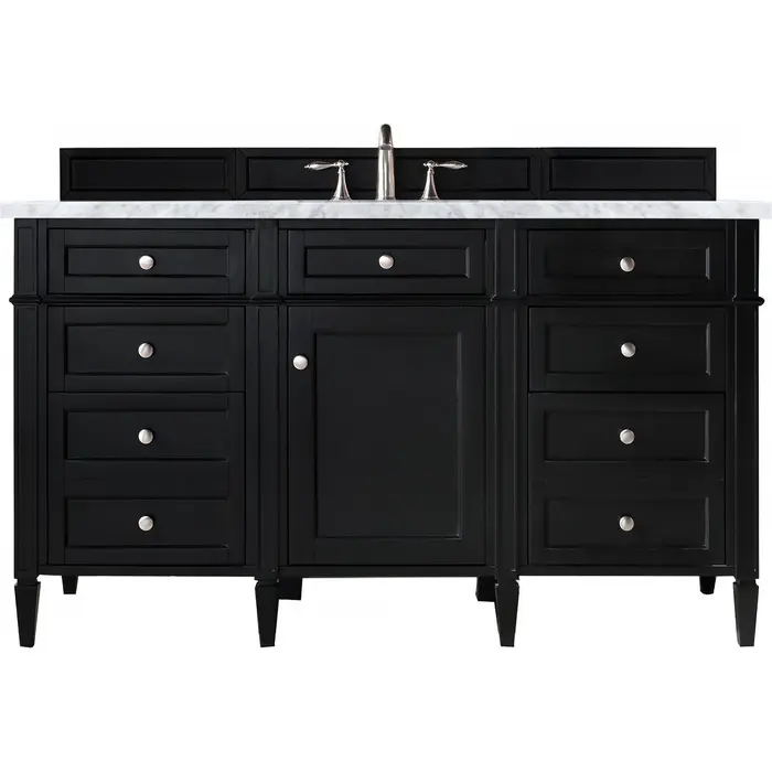 The Brittany 60" Black Onyx Single Vanity by James Martin Vanities features classic details that bridge both traditional and transitional styles. This beautiful piece of furniture includes one hide-away top row tip-out drawer, plus six full-depth drawers, two of which are double-height for storage of taller items. This cabinet also has one door, which conceals an interior shelf for ample storage. Handcrafted in yellow poplar solids and veneers with satin nickel hardware. Matching wood backsplash is included. The look is completed with a 3 CM eased edge Carrara Marble top and white ceramic rectangular sink.Single door cabinet with one adjustable interior shelf, one top-row tip-out drawer, and six standard full-extension drawersHardware Finish: Satin NickelSolid kiln-dried Grade A hardwoodCabinet is finished inside and out with a premium undercoat finish for superior moisture and UV resistanceSoft-close undermount drawer glides and soft-close door hingesDrawer bottoms are lined with our signature brushed aluminum laminateMatching decorative wood backsplash is included3 CM eased edge Carrara Marble top and one white porcelain rectangular sinkCountertop is pre-drilled for one 3-hole 8" spreadFaucet sold separatelyOur most popular collection, the Brittany was thoughtfully crafted to combine both traditional and modern style. The tapered legs are a recognizable nod to the past, while the straight lines and shaker-style detailing suggest a more contemporary aesthetic. Available in eight beautiful finishes, Brittany's versatile design blends seamlessly with a wide range of interior styling, while the expansive storage options make this collection a functional solution for any bathroom.1 year warranty against manufacturer's defects. We will repair or replace any defective product, if the product is defective in material or workmanship at our discretion. No warranty is expressed or implied regarding damages resulting from consumer misuse.