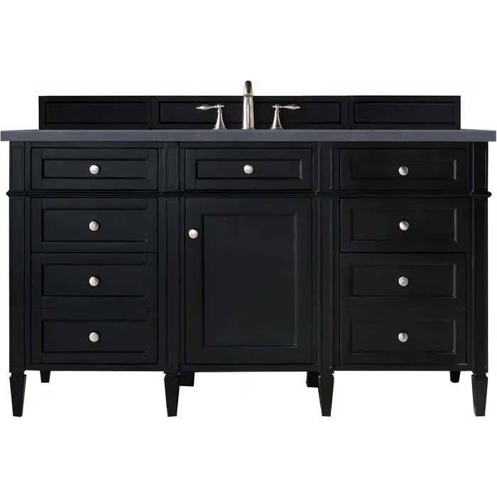 The Brittany 60" Black Onyx Single Vanity by James Martin Vanities features classic details that bridge both traditional and transitional styles. This beautiful piece of furniture includes one hide-away top row tip-out drawer, plus six full-depth drawers, two of which are double-height for storage of taller items. This cabinet also has one door, which conceals an interior shelf for ample storage. Handcrafted in yellow poplar solids and veneers with satin nickel hardware. Matching wood backsplash is included. The look is completed with a 3 CM eased edge Charcoal Soapstone Silestone top by Cosentino and one white ceramic sink.Single door cabinet with one adjustable interior shelf, one top-row tip-out drawer, and six standard full-extension drawersHardware Finish: Satin NickelSolid kiln-dried Grade A hardwoodCabinet is finished inside and out with a premium undercoat finish for superior moisture and UV resistanceSoft-close undermount drawer glides and soft-close door hingesDrawer bottoms are lined with our signature brushed aluminum laminateMatching decorative wood backsplash is included3 CM eased edge Charcoal Soapstone Silestone top and one white porcelain rectangular sinkCountertop is pre-drilled for one 3-hole 8" spreadFaucet sold separatelyOur most popular collection, the Brittany was thoughtfully crafted to combine both traditional and modern style. The tapered legs are a recognizable nod to the past, while the straight lines and shaker-style detailing suggest a more contemporary aesthetic. Available in eight beautiful finishes, Brittany's versatile design blends seamlessly with a wide range of interior styling, while the expansive storage options make this collection a functional solution for any bathroom.1 year warranty against manufacturer's defects. We will repair or replace any defective product, if the product is defective in material or workmanship at our discretion. No warranty is expressed or implied regarding damages resulting from consumer misuse.