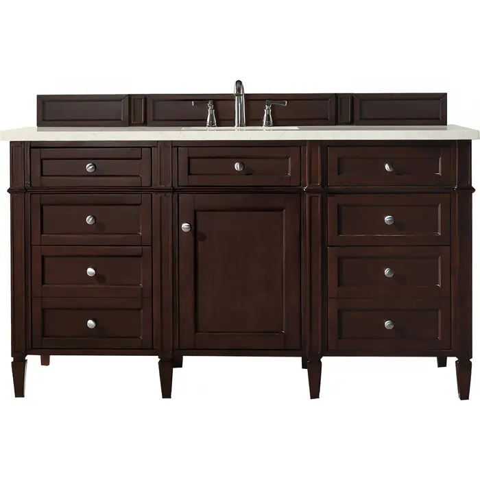 The Brittany 60" Black Onyx Single Vanity by James Martin Vanities features classic details that bridge both traditional and transitional styles. This beautiful piece of furniture includes one hide-away top row tip-out drawer, plus six full-depth drawers, two of which are double-height for storage of taller items. This cabinet also has one door, which conceals an interior shelf for ample storage. Handcrafted in yellow poplar solids and veneers with satin nickel hardware. Matching wood backsplash is included. The look is completed with a 3 CM eased edge Eternal Marfil Silestone top by Cosentino and one white ceramic sink.Single door cabinet with one adjustable interior shelf, one top-row tip-out drawer, and six standard full-extension drawersHardware Finish: Satin NickelSolid kiln-dried Grade A hardwoodCabinet is finished inside and out with a premium undercoat finish for superior moisture and UV resistanceSoft-close undermount drawer glides and soft-close door hingesDrawer bottoms are lined with our signature brushed aluminum laminateMatching decorative wood backsplash is included3 CM eased edge Eternal Marfil Silestone top and one white porcelain rectangular sinkCountertop is pre-drilled for one 3-hole 8" spreadFaucet sold separatelyOur most popular collection, the Brittany was thoughtfully crafted to combine both traditional and modern style. The tapered legs are a recognizable nod to the past, while the straight lines and shaker-style detailing suggest a more contemporary aesthetic. Available in eight beautiful finishes, Brittany's versatile design blends seamlessly with a wide range of interior styling, while the expansive storage options make this collection a functional solution for any bathroom.1 year warranty against manufacturer's defects. We will repair or replace any defective product, if the product is defective in material or workmanship at our discretion. No warranty is expressed or implied regarding damages resulting from consumer misuse.