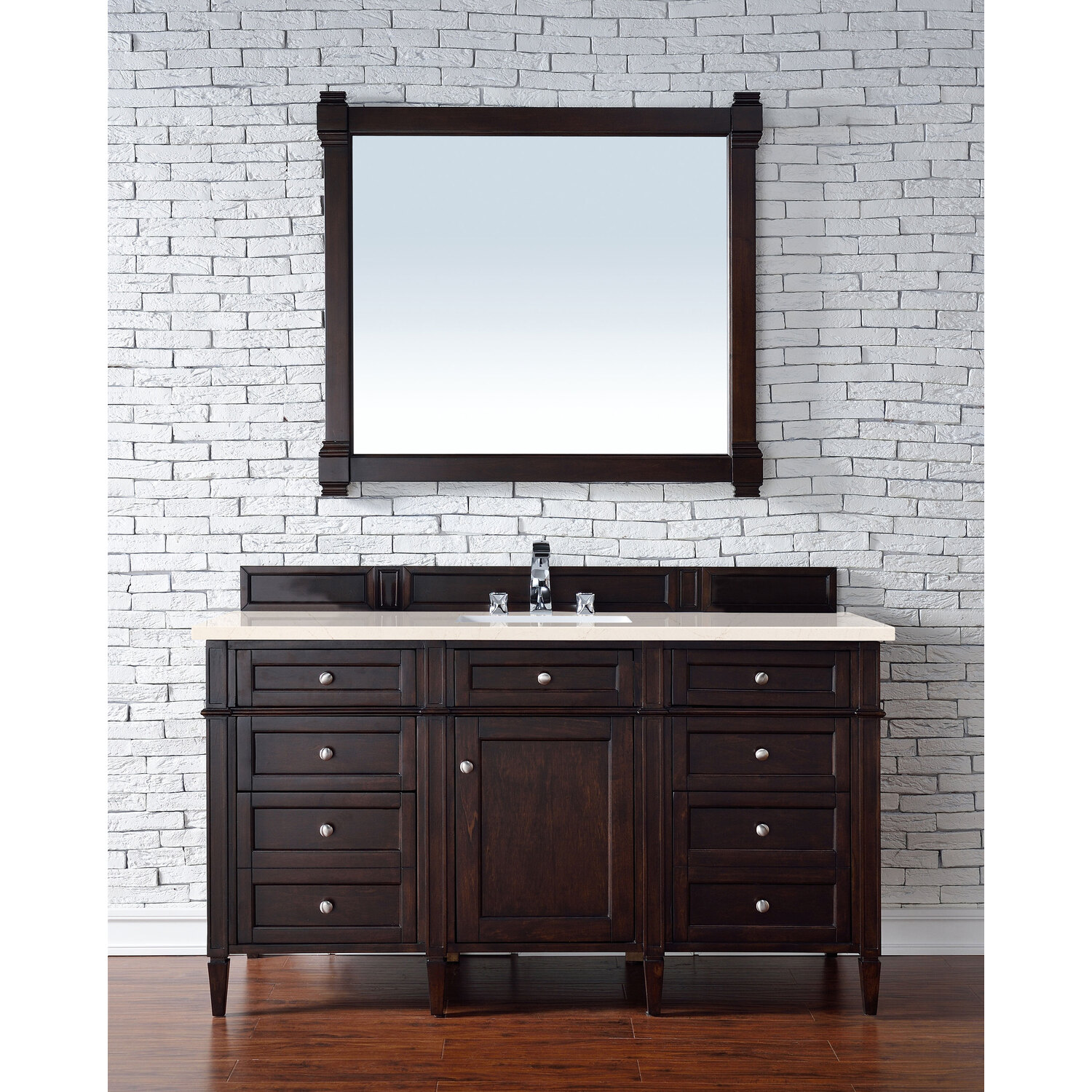 - Subtle luxury. James Martin Vanities most popular collection, Brittany, was designed to merge traditional and transitional tastes. The tapered legs are a nod to the past, but the restrained use of ornamentation suggests a modern aesthetic. Interior space and storage are ample, including our top row “tip out” drawers which utilize the space in front of the sink. Cabinets are crafted from kiln-dried North American Birch and White Poplar hardwoods. Seven widths of cabinet are offered in the Brittany series and are available in six finish options: Burnished Mahogany, Bright White, Urban Gray, Black Onyx, Saddle Brown and Sage Green. Three widths of coordinating mirrors will add finishing touches to your room.
