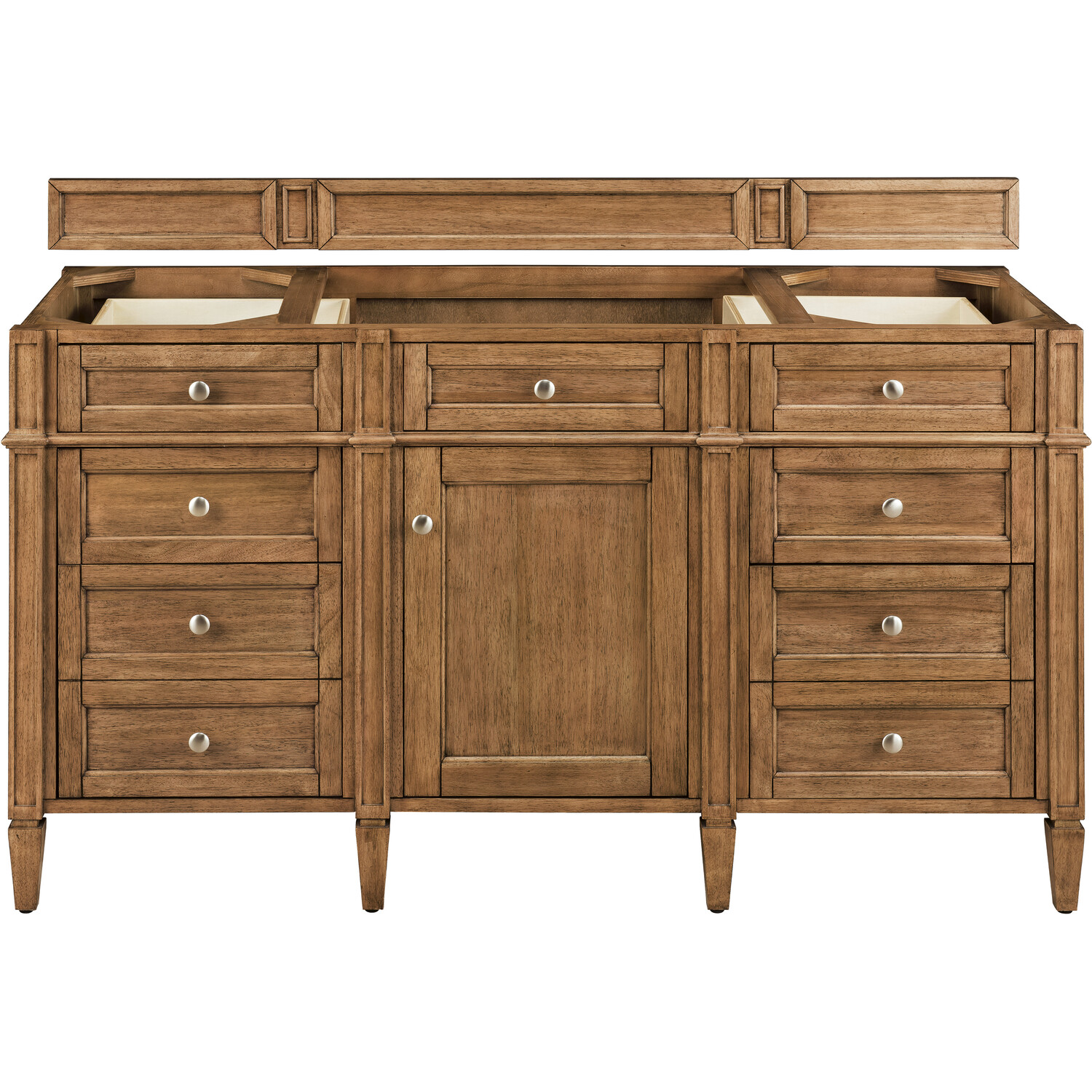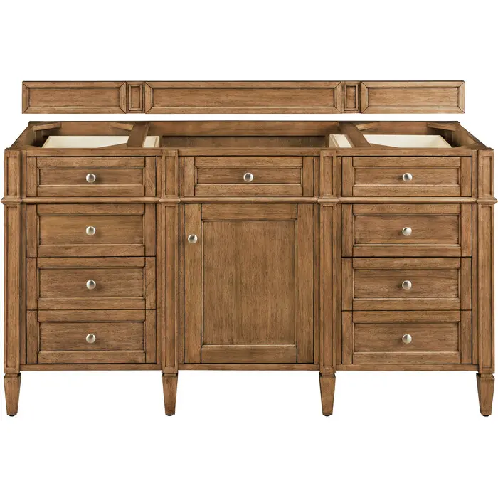 The Brittany 60" Saddle Brown Single Vanity by James Martin Vanities features classic details that bridge both traditional and transitional styles.  This beautiful piece of furniture includes one hide-away top row tip-out drawer, plus six full-depth drawers, two of which are double-height for storage of taller items.  This cabinet also has one door, which conceals an interior shelf, for ample storage.  Handcrafted in yellow poplar solids and veneers with satin nickel hardware.  Matching wood backsplash is included.One door Saddle Brown single vanity cabinet with seven drawers and interior shelf space; lower drawers are double-height; top drawers are tip-out styleHardware Finish: Satin NickelSolid kiln-dried Grade A hardwoodCabinet is finished inside and out with a premium undercoat finish for superior moisture and UV resistanceSoft-close undermount drawer glides and soft-close door hingesDrawer bottoms are lined with our signature brushed aluminum laminateMatching decorative wood backsplash is includedCabinet only, countertop and sink not includedSubtle Luxury, James Martin Vanities most popular collection; Brittany was designed to merge traditional and transitional tastes. The tapered legs are a nod to the past, but the restrained use of ornamentation suggests a modern aesthetic. Interior space and storage are ample, including our top row “tip out” drawers which utilize the space in front of the sink. Cabinets are crafted from kiln-dried North American Birch and White Poplar hardwoods. Seven widths of cabinet are offered in the Brittany series, and are available in six colors; Burnished Mahogany / Bright White / Urban Gray/ Black Onyx/ Saddle Brown/ Sage Green. Three widths of coordinating mirrors will add finishing touches to your room.1 year warranty against manufacturer's defects. We will repair or replace any defective product, if the product is defective in material or workmanship at our discretion. No warranty is expressed or implied regarding damages resulting from consumer misuse.