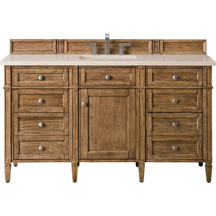 The Brittany 60" Saddle Brown Single Vanity by James Martin Vanities features classic details that bridge both traditional and transitional styles. This beautiful piece of furniture includes one hide-away top row tip-out drawer, plus six full-depth drawers, two of which are double-height for storage of taller items. This cabinet also has one door, which conceals an interior shelf for ample storage. Handcrafted in yellow poplar solids and veneers with satin nickel hardware. Matching wood backsplash is included. The look is completed with a 3 CM eased edge Eternal Marfil Silestone top by Cosentino and one white ceramic sink.Single door cabinet with one adjustable interior shelf, one top-row tip-out drawer, and six standard full-extension drawersHardware Finish: Satin NickelSolid kiln-dried Grade A hardwoodCabinet is finished inside and out with a premium undercoat finish for superior moisture and UV resistanceSoft-close undermount drawer glides and soft-close door hingesDrawer bottoms are lined with our signature brushed aluminum laminateMatching decorative wood backsplash is included3 CM eased edge Eternal Marfil Silestone top and one white porcelain rectangular sinkCountertop is pre-drilled for one 3-hole 8" spreadFaucet sold separatelySubtle luxury. James Martin Vanities most popular collection, Brittany, was designed to merge traditional and transitional tastes. The tapered legs are a nod to the past, but the restrained use of ornamentation suggests a modern aesthetic. Interior space and storage are ample, including our top row “tip out” drawers which utilize the space in front of the sink. Cabinets are crafted from kiln-dried North American Birch and White Poplar hardwoods. Seven widths of cabinet are offered in the Brittany series and are available in six finish options: Burnished Mahogany, Bright White, Urban Gray, Black Onyx, Saddle Brown and Sage Green. Three widths of coordinating mirrors will add finishing touches to your room.1 year warranty against manufacturer's defects. We will repair or replace any defective product, if the product is defective in material or workmanship at our discretion. No warranty is expressed or implied regarding damages resulting from consumer misuse.