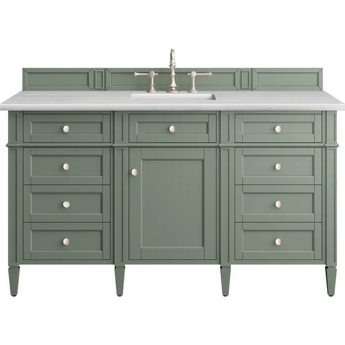The Smokey Celadon finish on the 60" Brittany Vanity adds a refreshing, natural element to any bathroom space. This moody, yet muted green, with subtle blue and grey undertones, brings the rich, timeless details of the Brittany collection to life. The 60" cabinet, with decorative wood backsplash, features optimal organization with one hide-away tip-out drawer plus six side drawers, two of which are double height for storing taller items. This cabinet also has one door, which conceals an interior shelf. All drawers are lined with an aluminum laminate surface for easy cleaning and are equipped with undermount soft-close slides. The Arctic Fall Solid Surface top adds an exquisite, modern touch with its soft white finish, grey undertones, and a natural-looking greyish horizontal veining. All of our 3 CM tops include a porcelain undermount sink.Single door cabinet with one adjustable interior shelf, one top-row tip-out drawer, and six standard full-extension drawersHardware Finish: Satin NickelSolid kiln-dried Grade A hardwoodCabinet is finished inside and out with a premium undercoat finish for superior moisture and UV resistanceSoft-close undermount drawer glides and soft-close door hingesDrawer bottoms are lined with our signature brushed aluminum laminateMatching decorative wood backsplash is included3 CM eased edge Arctic Fall Solid Surface top and one white porcelain rectangular sinkCountertop is pre-drilled for one 3-hole 8" spreadFaucet sold separatelyOur most popular collection, the Brittany was thoughtfully crafted to combine both traditional and modern style. The tapered legs are a recognizable nod to the past, while the straight lines and shaker-style detailing suggest a more contemporary aesthetic. Available in eight beautiful finishes, Brittany's versatile design blends seamlessly with a wide range of interior styling, while the expansive storage options make this collection a functional solution for any bathroom.1 year warranty against manufacturer's defects. We will repair or replace any defective product, if the product is defective in material or workmanship at our discretion. No warranty is expressed or implied regarding damages resulting from consumer misuse.
