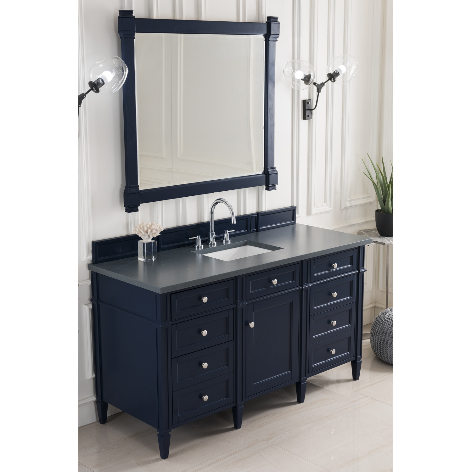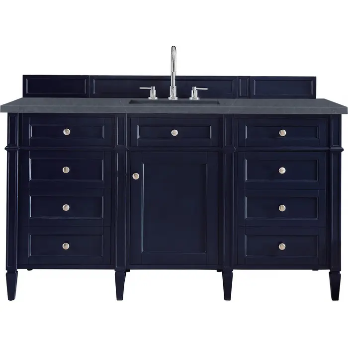 The Brittany 60" Victory Blue Single Vanity by James Martin Vanities features classic details that bridge both traditional and transitional styles. This beautiful piece of furniture includes one hide-away top row tip-out drawer, plus six full-depth drawers, two of which are double-height for storage of taller items. This cabinet also has one door, which conceals an interior shelf for ample storage. Handcrafted in yellow poplar solids and veneers with satin nickel hardware. Matching wood backsplash is included. The look is completed with a 3 CM eased edge Charcoal Soapstone Silestone top by Cosentino and one white ceramic sink.Single door cabinet with one adjustable interior shelf, one top-row tip-out drawer, and six standard full-extension drawersHardware Finish: Satin NickelSolid kiln-dried Grade A hardwoodCabinet is finished inside and out with a premium undercoat finish for superior moisture and UV resistanceSoft-close undermount drawer glides and soft-close door hingesDrawer bottoms are lined with our signature brushed aluminum laminateMatching decorative wood backsplash is included3 CM eased edge Charcoal Soapstone Silestone top and one white porcelain rectangular sinkCountertop is pre-drilled for one 3-hole 8" spreadFaucet sold separatelyOur most popular collection, the Brittany was thoughtfully crafted to combine both traditional and modern style. The tapered legs are a recognizable nod to the past, while the straight lines and shaker-style detailing suggest a more contemporary aesthetic. Available in eight beautiful finishes, Brittany's versatile design blends seamlessly with a wide range of interior styling, while the expansive storage options make this collection a functional solution for any bathroom.1 year warranty against manufacturer's defects. We will repair or replace any defective product, if the product is defective in material or workmanship at our discretion. No warranty is expressed or implied regarding damages resulting from consumer misuse.