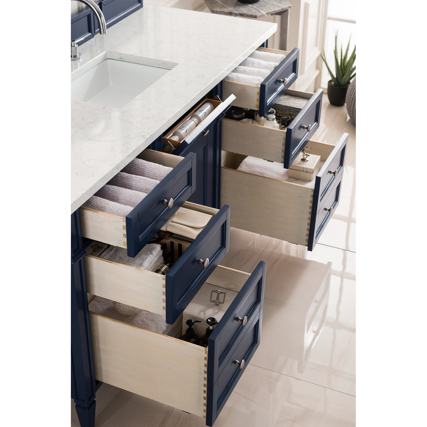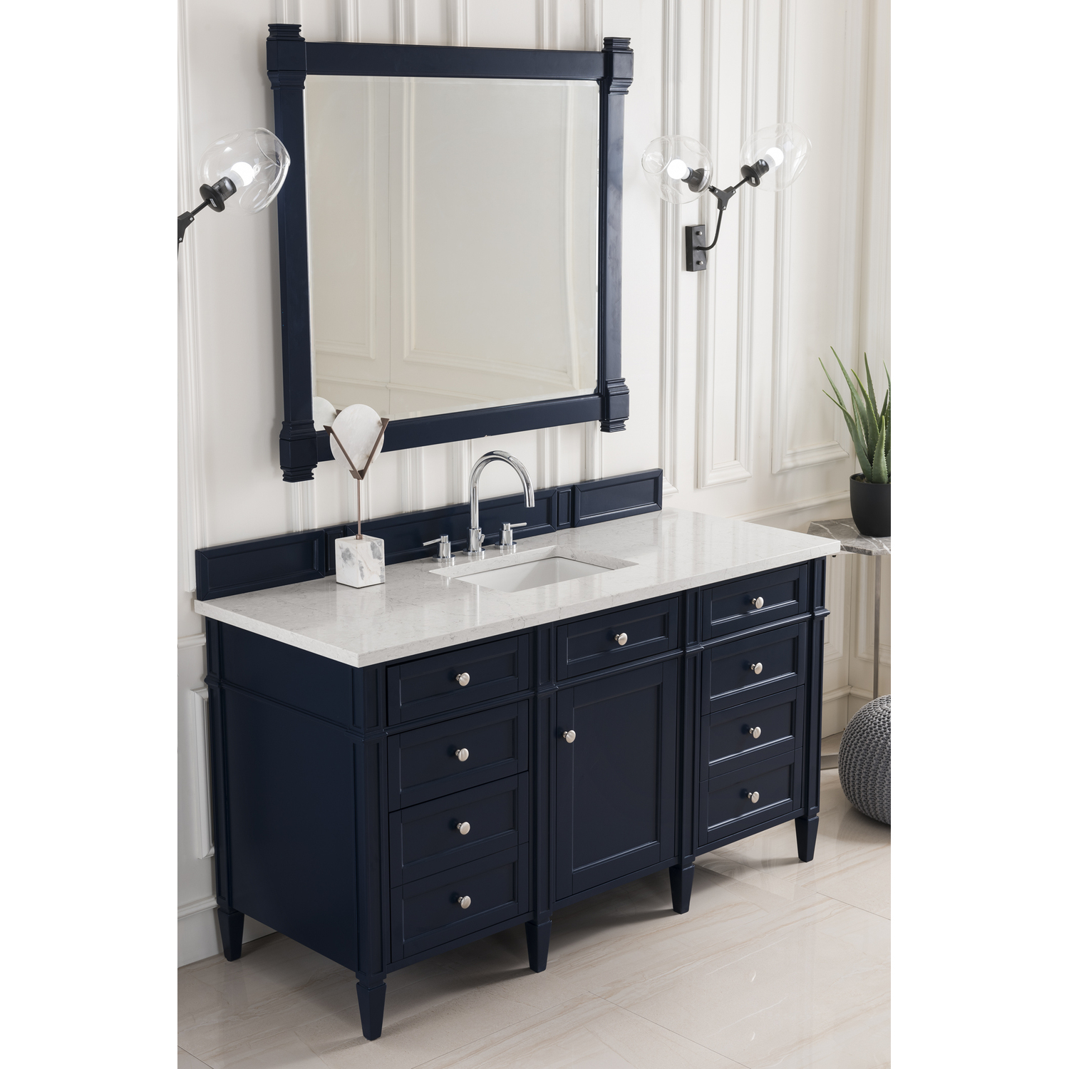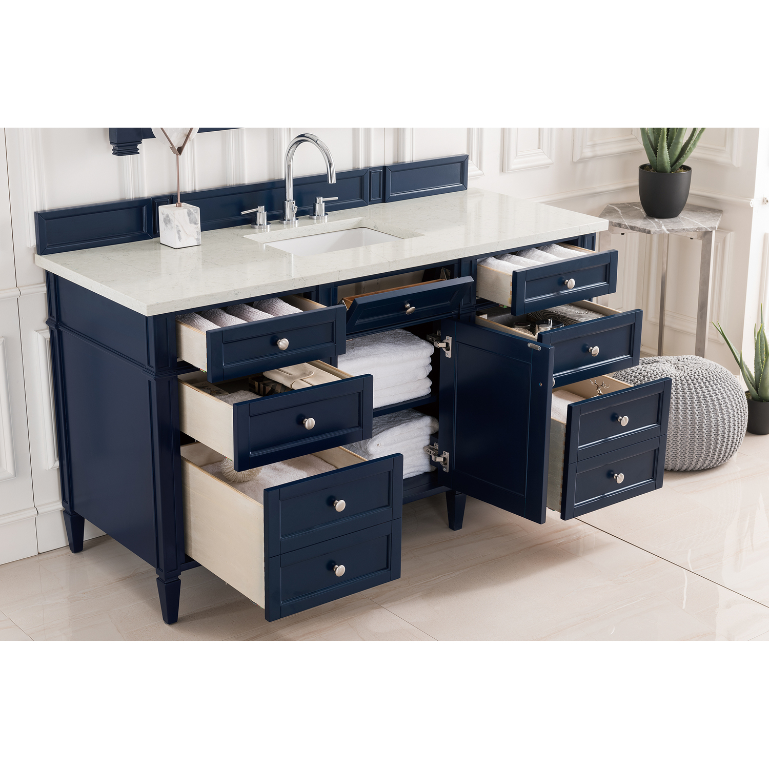 The Brittany 60" Victory Blue Single Vanity by James Martin Vanities features classic details that bridge both traditional and transitional styles. This beautiful piece of furniture includes one hide-away top row tip-out drawer, plus six full-depth drawers, two of which are double-height for storage of taller items. This cabinet also has one door, which conceals an interior shelf for ample storage. Handcrafted in yellow poplar solids and veneers with satin nickel hardware. Matching wood backsplash is included. The look is completed with a 3 CM eased edge Eternal Jasmine Pearl Silestone top by Cosentino and one white ceramic sink.Single door cabinet with one adjustable interior shelf, one top-row tip-out drawer, and six standard full-extension drawersHardware Finish: Satin NickelSolid kiln-dried Grade A hardwoodCabinet is finished inside and out with a premium undercoat finish for superior moisture and UV resistanceSoft-close undermount drawer glides and soft-close door hingesDrawer bottoms are lined with our signature brushed aluminum laminateMatching decorative wood backsplash is included3 CM eased edge Eternal Jasmine Pearl Silestone top and one white porcelain rectangular sinkCountertop is pre-drilled for one 3-hole 8" spreadFaucet sold separatelyOur most popular collection, the Brittany was thoughtfully crafted to combine both traditional and modern style. The tapered legs are a recognizable nod to the past, while the straight lines and shaker-style detailing suggest a more contemporary aesthetic. Available in eight beautiful finishes, Brittany's versatile design blends seamlessly with a wide range of interior styling, while the expansive storage options make this collection a functional solution for any bathroom.1 year warranty against manufacturer's defects. We will repair or replace any defective product, if the product is defective in material or workmanship at our discretion. No warranty is expressed or implied regarding damages resulting from consumer misuse.